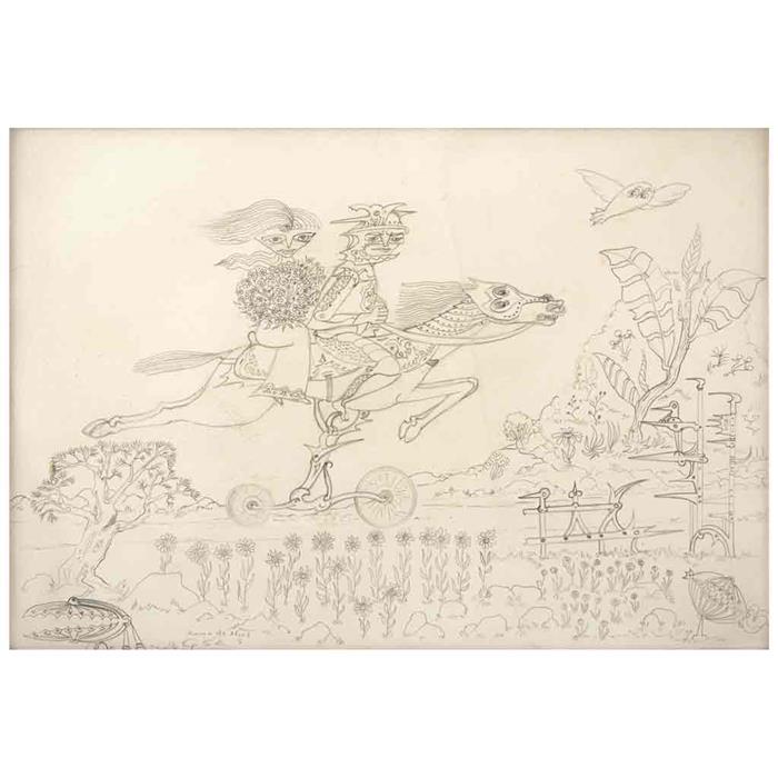 Subasta 1029T, Lote # 300 GUILLERMO SILVA SANTAMARIA (Bogotá, Colombia, 1921 - Noruega, 2007) Luna de miel Firmado Lápiz de grafito sobre papel Presenta un doblez y ligeros detalles de conservación. Fue un sobresaliente pintor y grabador surrealista colombiano reconocido a nivel internacional; su trabajo ha sido exhibido en los cuatro continentes, estudió en Francia, trabajó en Estados Unidos, tuvo su propio taller en Colombia, produjo obra en Perú, residió un tiempo en México, exhibió con gran éxito en Suecia y España, obtuvo el primer premio de la Sociedad de Pintores y Grabadores en Canadá, y vivió 10 años en India, país donde pintó, esculpió y se convirtió en maestro de yoga. Desde 1993 pasó sus veranos en Noruega, lugar donde falleció en 2007. 25 x 36 cm Estimado $8,000-15,000