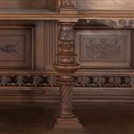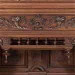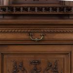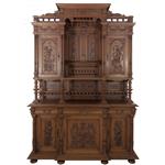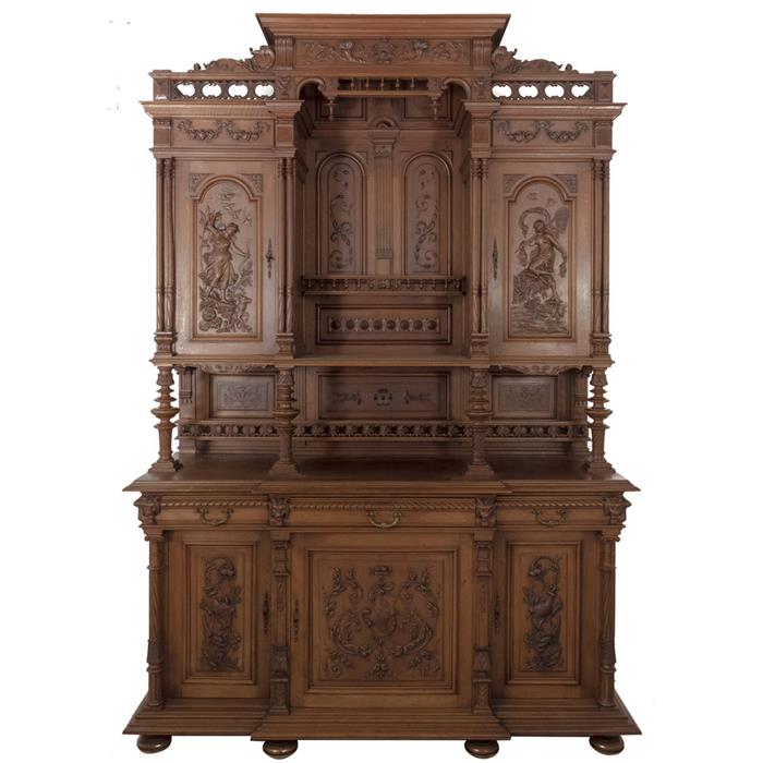 Subasta 1029T, Lote # 267 Buffet. Francia. Siglo XX. En talla de madera de nogal. A 2 cuerpos. Con 5 puertas abatibles, 3 cajones con tiradores de metal dorado y soportes tipo bollo. Decorado con elementos vegetales, florales, orgánicos, zoomorfos, frutales, arquitectónicos, geométricos, antropomorfos, escena de caza, escena de pesca, cartela, barandillas, balaustradas, lacería, mascarones zoomorfos, roleos, pináculos y molduras. Presenta marcas, manchas, desgaste, desprendimientos y polilla. Dimensiones: 268 x 183 x 56 cm. Estimado $15,000-25,000