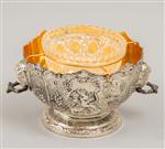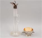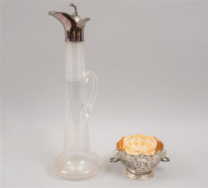 Decorados con motivos orgánicos, amorcillos y vides. Jarra con diseños anillados 51 cm de altura. Depósito con anillado para depósito interno de vidrio prensado. Depósito de metal con mascarones del dios Baco y asas anilladas. 9.5 x 16 x 14 cm