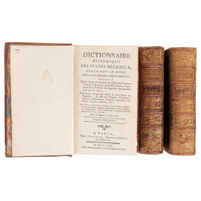 Delacroix, Jean Francois.Dictionnaire Historique des Cultes Religieux Établis dans le Monde Depuis son Origine Jusqu'a Présent; Ouvrage dans Lequel on Trouvera les Différentes Manières d'Adorer la Divinité. Paris: Vincent, Imprimeur - Libraire, 1770. 8o., LVI + 726; 848; 408 + 400 p. Tomos I - III. Tomo I: Una hoja inserta entre las páginas 254 - 255 y 612 - 613. Tomo II: Una hoja inserta entre las páginas 404 - 405. Tomo III: en dos partes, encuadernadas en un mismo volumen. Pastas y lomos gastados. Encuadernados en pasta dura, en piel. Piezas: 3.