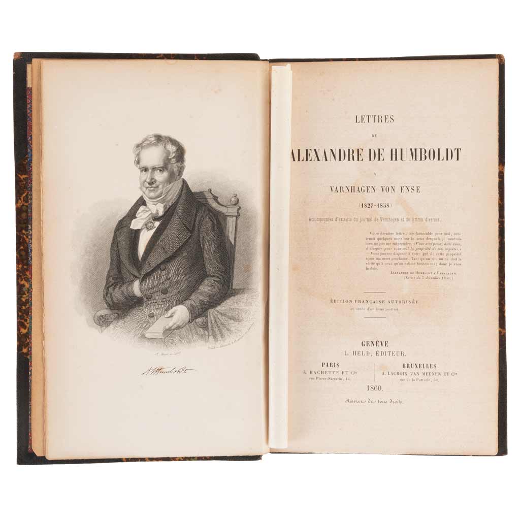 Subasta 957, Lote # 301 APB - Humboldt, Alexandre de. Lettres de… a Varnhagen von Ense (1827 - 1858). Accompagnées d'Extraits du Journal de Varnhagen et de Lettres Diverses. Genéve / Paris / Bruxelles: L. Held / L. Hachette et Cie. / A. Lacroix van Meenen et Cie., 1860. 8o. marquilla, XVI + 285 p. Édition francaise autorisée. Frontispicio, retrato de Humboldt. Ex Libris de antiguo propietario. Gracias quebradas. Encuadernado en pasta dura, lomo y puntas en piel. Primera edición francesa de la compilación de correspondencia entre uno de los más grandes científicos de su tiempo Alejandro de Humboldt y un diplomático amigo suyo Karl Vanhagen von Ense. También se incluyen algunos extractos del diario de Varnhagen para proporcionar un comentario sobre las cartas, que presentan detallados registros de la vida, hábitos y actividad de Humboldt, de suma importancia para tener una imagen más precisa del pensamiento y carácter de Humboldt. Está colección fue publicada por Ludmilla Assing, sobrina de Varnhagen, después de la muerte de ambos. Estimado $9,000-10,000
