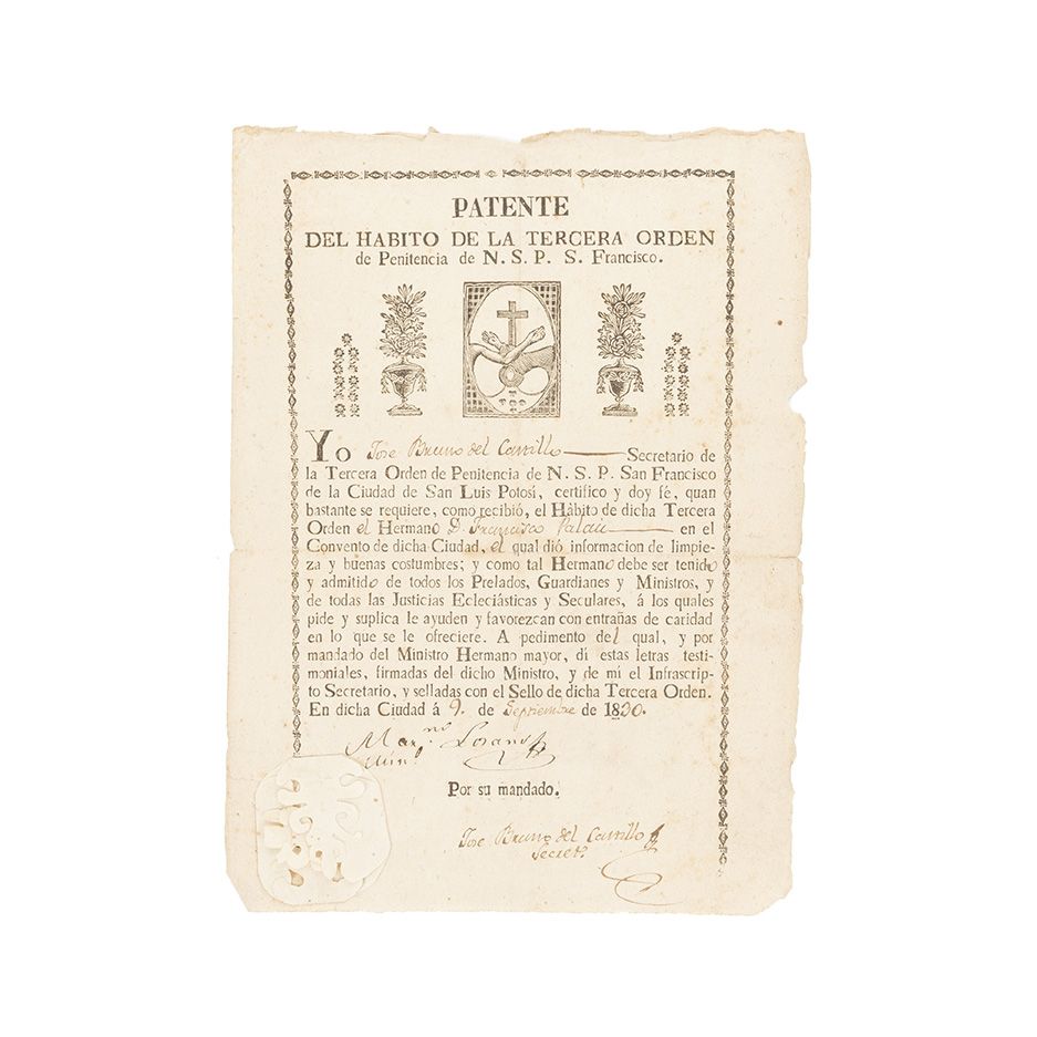 Subasta 957, Lote # 320 J - Bueno del Castillo, José. Certificado de Hábito de D. Francisco Palau. "Yo Jose Bueno del Castillo Secretario de la Tercera Orden de Penitencia de N. S. P. San Francisco de la Ciudad de San Luis Potosí, certifico y doy fé, quan bastante se requiere, como recibió, el Hábito de dicha Tercera Orden el Hermano D. Francisco Palau en el Convento de dicha Ciudad, el qual dió informacion de limpieza y buenas costumbres; y como tal Hermano debe ser tenido y admitido de todos los Prelados, Guardianes y Ministros, y de todas las Justicias Eclesiásticas y Seculares, á los quales pide y suplica le ayuden y favorezcan con entrañas de caridad en lo que se le ofreciere". San Luis Potosí, 9 de septiembre de 1830. 1 h. 29.5 x 21.7 cm. Conserva sello troquelado. Manchas de óxido. Pequeñas rasgaduras y dobleces en márgenes; sin punta inferior derecha. Estimado $2,000-3,000