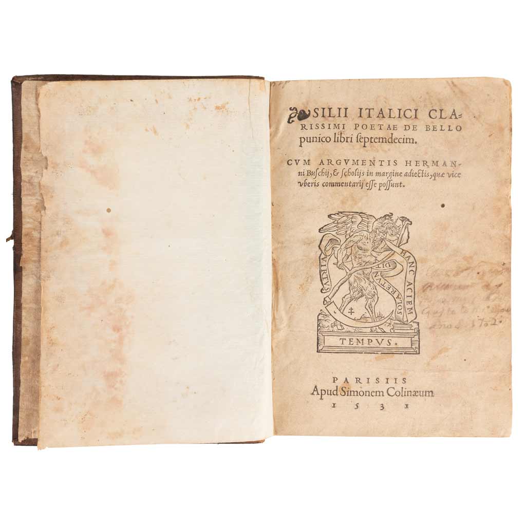 Subasta 957, Lote # 314 DA - Silius Italicus, Tiberius Catius. Silii Italici Clarissimi Poetae de Bello Punico Libri Septemdecim. Parisiis: Apud Simonem Colinæum, 1531. 16o. marquilla, 223 fos. 12 libros en un tomo. Subrayado y notas en algunas hojas. Texto y pastas con mancha de humedad en margen externo, afecta más algunas hojas. Surcos de polilla en pasta anterior y primeras nueve fojas. Pastas gastadas. Encuadernado en pasta dura, en piel. Silio Itálico fue un célebre político y poeta latino, reconocido por su obra Punica, en la que aborda la Segunda Guerra Púnica, entre Roma y Cartago, de la mano de la construcción histórica de Tito Livio. Sentenciado a muerte por un tumor incurable, Silio Itálico construyó los últimos libros de manera apresurada, sin perder la fuerza y dramatismo de los primeros. Estimado $10,000-12,000
