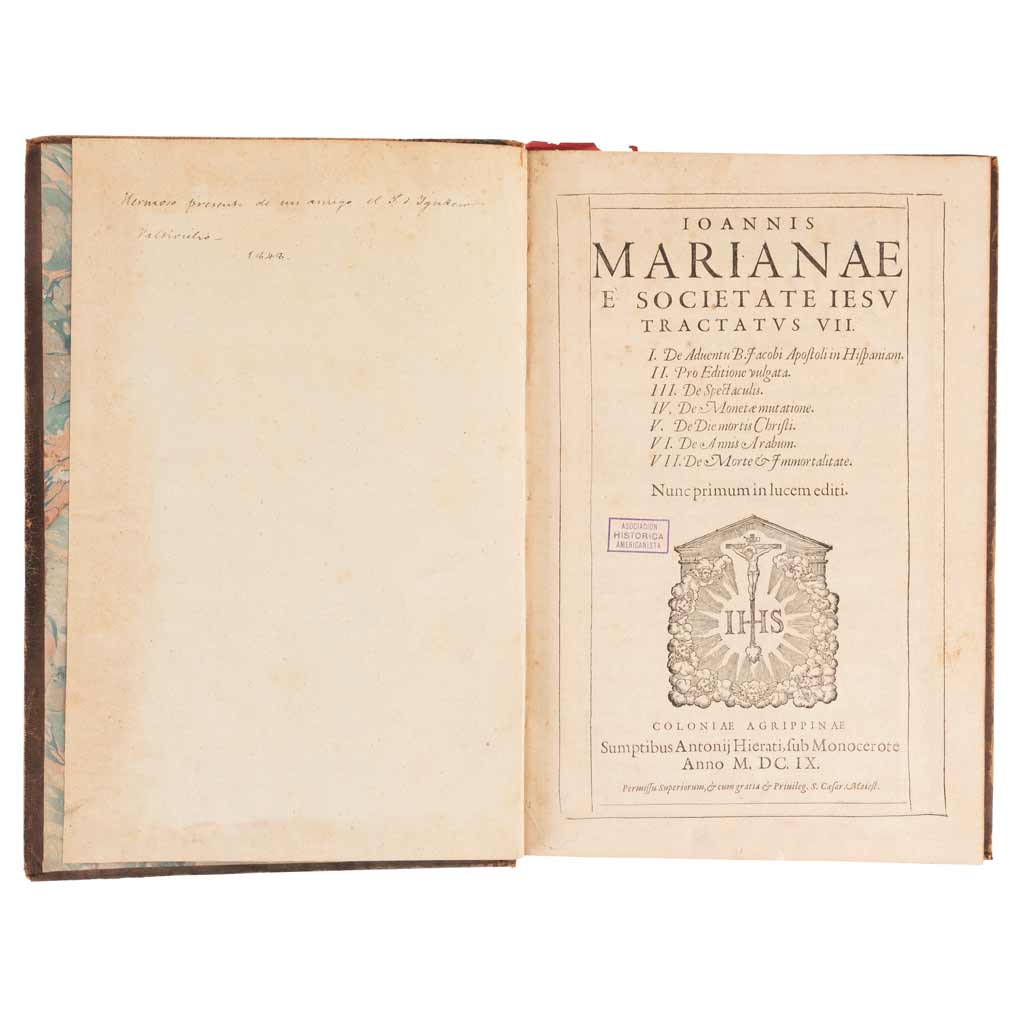 Subasta 957, Lote # 306 BB - Marianæ, Ioannis. Tractatvs VII. Coloniæ Agrippinæ: Sumptibus Antonij Hierati, 1609. 4o. marquilla, 4 h. + 444 p. + 8 h. Contiene: I. De Aduentu B. Jacobi Apostoli in Hispaniam; II. Pro Editione Vulgata; III. De Spectaculis; IV. De Monetæ Mutatione; V. De die Mortis Christi; VI. De Annis Arabum; VII. De Morte et Immortalitate. Sellos de antigua biblitoecaPáginas 3, 5 y 7 rasgadas en margen externo; página 423 sin punta superior. Errores de paginación. Sin cofia; pasta anterior con rasgaduras y marcas de quemaduras; lomo gastado. Encuadernado en pasta dura, en piel. Juan de Mariana, de la Sociedad de Jesús (Societate Iesv), fue un teólogo e historiador español reconocido por sus doctrinas sobre tiranicidio (o que fueron relacionadas con el mismo). En el año de 1610, su "De rege et regis institutione" fue quemado por el parlamento parisino por este motivo. En general, de Mariana expone los principios que deben regir una monarquía, tomando en cuenta al rey como cualquier otro integrante del estado, regidos por las mismas leyes morales; debe impedir que los impuestos afecten a la población productora. Sin embargo, también justifica la revolución y la ejecución de un rey si se vuelve tirano. Estimado $12,000-15,000