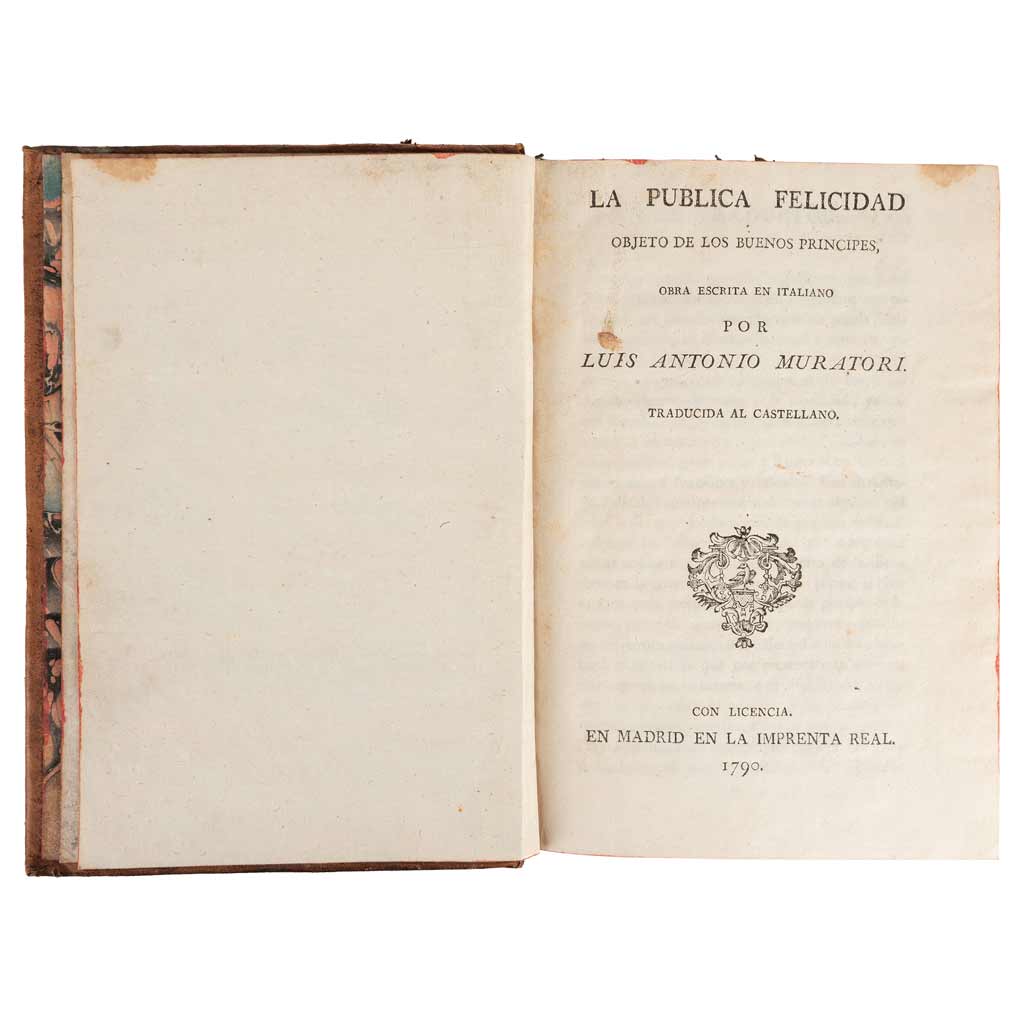 BB - Muratori, Luis Antonio.La Pública Felicidad. Objeto de los Buenos Príncipes. Madrid: Imprenta Real, 1790. 8o. marquilla, LXII + 392 p. Pastas rasgadas en margen superior. Encuadernado en pasta dura, en piel. "Aquí se trata de un bien que aunque se desea mucho en el mundo no puede ser jamás puro ni permanente […] No hay más que un país donde podremos gozar de una perfecta alegría y de una tranquilidad inmutable si llegamos á entrar en él por la misericordia de Dios." A través del uso del pensamiento crítico, Muratori defiende la importancia de la educación en la construcción de la sociedad, desde un punto de vista político y sin dejar de lado las consecuencias ontológicas, sobre todo en relación con la Felicidad humana.