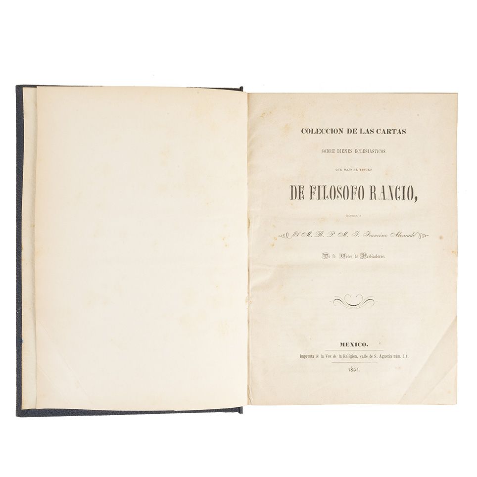 J - Alvarado, Francisco.Cartas del Filósofo Rancio. México: Imprenta de la Voz de la Religión, 1851. 4o. marquilla, 607 p. Mancha de tinta en tercio superior de página 64; rasgadura de margen exterior a centro en página 227. Encuadernado en pasta dura, en piel. Teólogo y filósofo dominico, Francisco Alvarado defendió los principios teóricos escolásticos del momento y se opuso a cualquier tipo de cambio, lo que lo llevó a ser nombrado por Fernando VII consejero del Tribunal Supremo de la Inquisición.