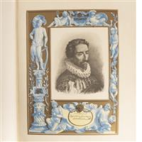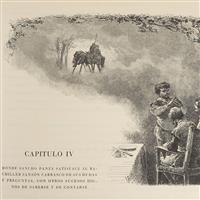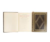 Subasta 957, Lote # 311 DA - Cervantes Saavedra, Miguel de. El Ingenioso Hidalgo Don Quijote de la Mancha. Barcelona: Montaner y Simon, S. A., 1930. fo. marquilla, 1 h. + LXXXI + 567 p. + 3 h.; 635 p. + 2 h. En dos tomos. Principales comentaristas de los que se incluyen notas: Américo Castro, Sebastián de Covarrubias, Pascual de Gayangos, Juan Antonio Pellicer, Julio Puyol y Alonso, entre otros. Semblanza por Miguel S. Oliver. Ilustraciones de Ricardo Balaca y José Luis Pellicer. Pastas y lomos gastados, gracias quebradas. Encuadernados en pasta dura, en piel. Piezas: 2. Estimado $3,000-4,000