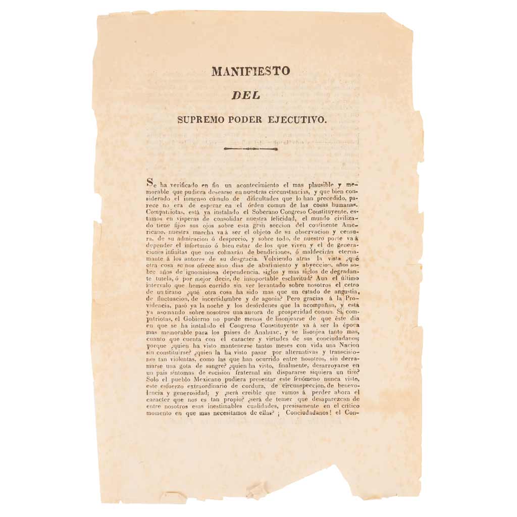 Subasta 957, Lote # 259 AC1823 - Domínguez, Miguel - Guerrero, Vicente - Michelena, José Mariano. Manifiesto del Supremo Poder Ejecutivo. "Compatriotas, está ya instalado en Soberano Congreso Constituyente, estamos en vísperas de consolidar nuestra felicidad, el mundo civilizado tiene fijos sus ojos sobre esta gran seccion del continente Americano, nuestra marcha va á ser el objeto de su observacion y censura, de su admiracion ó desprecio, y sobre todo, de nuestro porte va á depender el infortunio ó bien estar de los que viven y el de generaciones infinitas que nos colmarán de bendiciones, ó maldecirán eternamente á los antores de su desgracia". Palacio Nacional de México: En la Imprenta del Supremo Gobierno en Palacio, 7 de noviembre de 1823. 1 h. 30.5 x 20.2 cm. Rasgaduras y faltantes en márgenes; rasgadura en tercio medio, afecta poco texto. Estimado $30,000-40,000