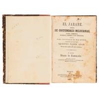 Subasta 957, Lote # 207 DA - Zamacois, Niceto de. El Jarabe Obra de Costumbres Mejicanas, Jocosa, Simpática, Burlesca, Satírica y de Carcajadas, Escrita para Desterrar el Mal Humor, Herencia que nos Legó Nuestro Padre Adán por un Nécio Antojo que Quiso Satisfacer. Méjico: Imprenta de Luis Inclán, 1861. 16o. marquilla, 510 p. + 1 h. Segunda edición notablemente corregida y adornada con amenas litografías. Tres láminas. Portada con faltantes en margen externo. Algunas páginas con manchas de óxido, afecta más una lámina. Encuadernado en pasta dura, lomo en tela. Estimado $7,000-9,000