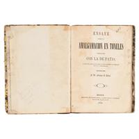 BA - Uslar, Germán de.Ensaye sobre la Amalgamación en Toneles Comparada con la de Patio, y de Fijar las Reglas para Cuando Convenga el Empleo de Uno u Otro Método. México: Imprenta de Andrés Boix, a cargo de M. C. Ituarte, 1853. 8o., XX + 48 p. Sello seco de antiguo propietario. Tres láminas plegadas (una dibujada). Pastas gastadas. Texto con manchas de humedad en márgenes. Encuadernado en pasta dura, lomo en piel.