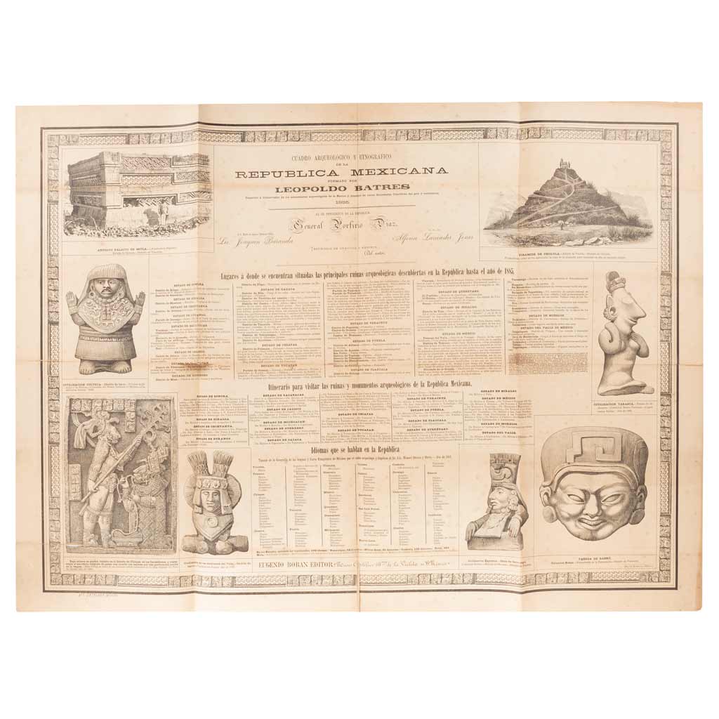 Subasta 957, Lote # 225 AB - Boban, Eugène - Batres, Leopoldo. Cuadro Arqueológico y Etnográfico de la República Mexicana. México: Eugenio Boban, Editor (Imp. de Murguía), 1885. 1 h. 66 x 90 cm., Rasgada y restaurada en pliegues. Formado por Leopoldo Batres y editado por el arqueólogo y anticuario francés, Eugène Boban. Contiene una lista de los principales sitios arqueológicos mexicanos, itinerarios para visitar dichos lugares y una relación de las lenguas indígenas habladas en la República Mexicana. En los márgenes, se presentan recuadros con distintas muestras de piezas y monumentos arqueológicos: Antiguo palacio de Mitla, ídolos de barro pertenecientes a la civilización tolteca y zapoteca, una cabeza de barro de la colección Boban, la pirámide de Cholula, entre otros. Eugène Boban (1834 - 1908), fue uno de los principales coleccionistas de piezas arqueológicas mesoamericanas del siglo XIX. Durante el Segundo Imperio, formó parte de la Comisión Científica Francesa en México y sirvió como arqueólogo oficial de la Corte de Maximiliano. Proveyó de piezas arqueológicas a los museos europeos y se encargó de organizar y publicar la colección de manuscritos prehispánicos de Eugène Goupil. Asimismo, ha sido objeto de una gran controversia, ya que algunas de las piezas arqueológicas que vendió a importantes museos europeos, y que fueron exhibidas públicamente por décadas, han sido recientemente denunciadas como falsificaciones. Muy raro en comercio. Estimado $12,000-14,000