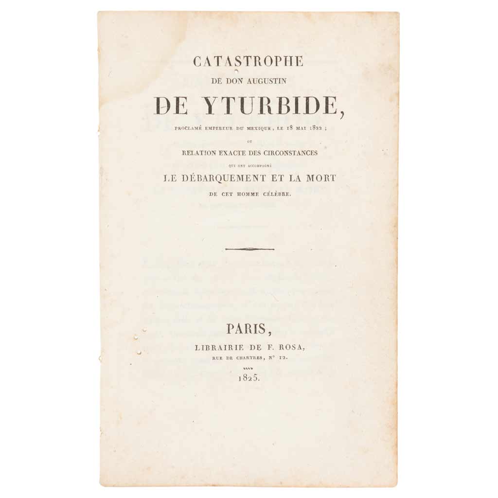 Subasta 957, Lote # 254 AC1822 - Iturbide, Agustín de. Catastrophe de Don. Aug. de Yturbide Proclamé Empereur du Mexique, 18 Mai, 1822, ou Rélation Exacte des Circonstances qui Ont Accompagné le Débarquement et la Mort de cet Homme Célèbre. París: Librería de F. Rosa, 1825. 8o. marquilla, Portada + 21 p. Pequeños punto de polilla sin afectar texto. Primera edición en francés realizada simultáneamente a la edición de español por la misma imprenta. Encuadernado en rústica. Esta obra aborda el tema más polémico relacionado al Primer Imperio: la muerte de Agustín de Iturbide. En este casi desconocido folleto, el autor se muestra hostil a Felipe de la Garza y partidario de la idea de que el comandante engañó vilmente a Iturbide para llevarlo ante los diputados de Padilla en Tamaulipas, quienes lo condenaron a muerte. Cinco días antes de su asesinato, Iturbide arribó al puerto de Soto la Marina, Tamaulipas, proveniente de Europa tras el exilio de poco más de un año, ignorando por completo el parricida decreto que los legisladores mexicanos habían promulgado con el fin de evitar que el consumador de la Independencia retornara al territorio nacional. El objetivo de Iturbide de regresar al país era ofrecer sus servicios a las autoridades mexicanas ante el peligro de una invasión por parte de la Santa Alianza, la cual pretendía reconquistar México. De la Garza trasladó a Iturbide a Padilla, en donde se encontraba sesionando el Congreso local del recién creado estado de Tamaulipas. El gobernador era Bernardo Gutiérrez de Lara, quien había simpatizado con Hidalgo y Morelos, dirigiendo a un grupo de insurgentes en la zona de Texas. En su defensa, Iturbide arguyó la posible invasión que se preparaba con ayuda de la Santa Alianza, pero nadie le creyó. El congreso local ordenó cumplir el decreto federal y el 19 de julio de 1824 Iturbide fue fusilado. La presente obra narra los últimos días de Iturbide, desde que llega a Soto la Marina, su captura, traslado a Padilla, proceso y su fusilamiento. Además, reproduce las últimas cartas de Iturbide: las dos escritas en Padilla el 19 de julio de 1824, a pocas horas de ser fusilado. La segunda carta contiene sus famosas últimas palabras: "Mexicanos, en el acto mismo de mi muerte os recomiendo el amor a la patria y observancia de nuestra santa religión; ella es quien os ha de conducir a la gloria. Muero por haber venido a ayudaros, y muero gustoso, porque muero entre vosotros: muero con honor, no como traidor: no quedará a mis hijos y su posteridad esta mancha: no soy traidor…" No existen registros de venta de esta primera edición. Estimado $22,000-28,000