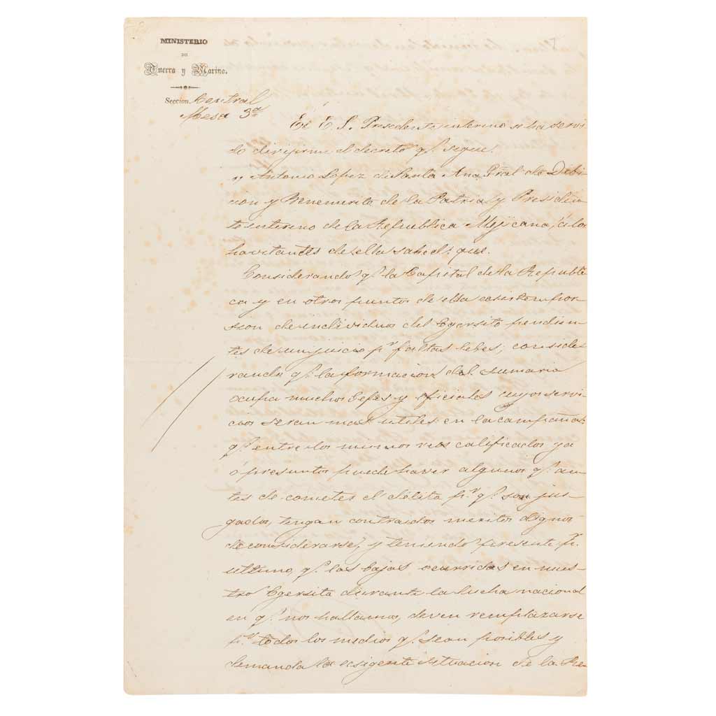 En atención a las numerosas bajas del ejército y para paliar la falta de jefes y oficiales por la situación casi permanente de guerra en la nación se establecieron: "Articulo 1, se sobresera, en todos los juicios militares pendientes y cuya formacion sea por facultad o delitos que no enfrenten prejuicios de tercero. Articulo 2, los calificados ya…de los mismos delitos sean puestos inmediatamente en libertad volviendo a ser puestos al que pertenecieron, o destinándolos en otros segun convenga al mejor servicio de la nación…". México, mayo 22 de 1847. Firma. Membrete. Pequeño faltante en doblez.