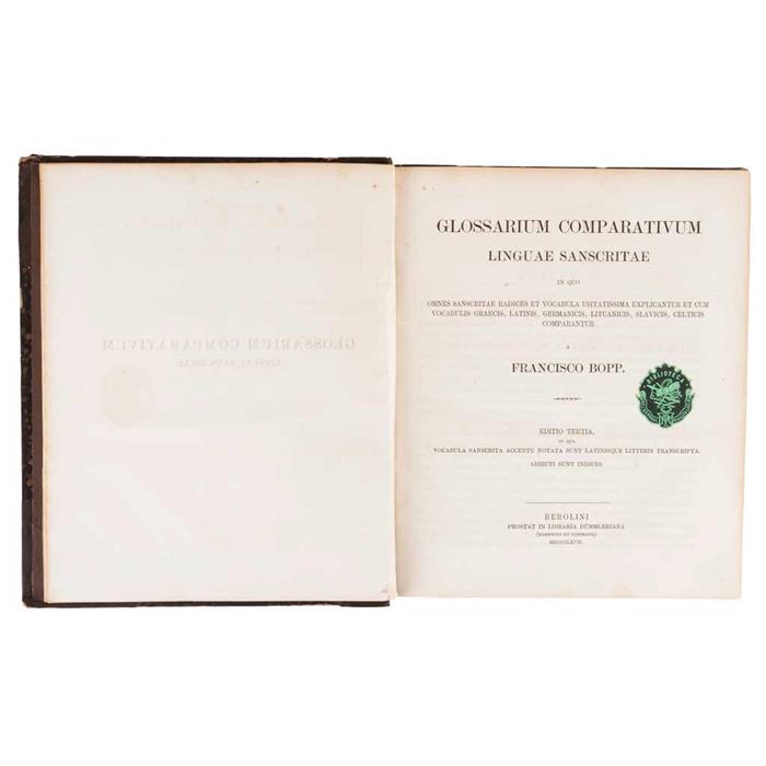 4o. marquilla, VIII + 492 p. Omnes sanscritae radices et vocabula usitassima explicantur et cum vocabulis graecis, latinis, germanicus, lituanicus, slavicus, celticis comparantur. Ex Libris de Vicente Riva Palacio. Encuadernado en pasta dura, lomo y puntas en piel.
