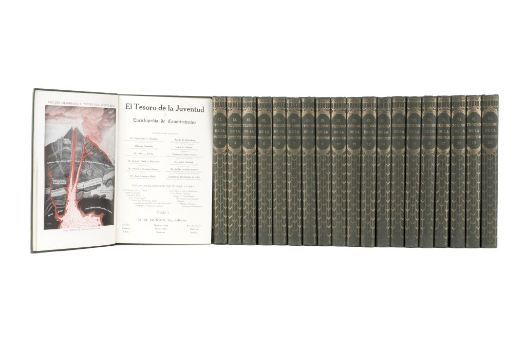 Subasta 957, Lote # 383 DA - El Tesoro de la Juventud. Enciclopedia de Conocimientos. Buenos Aires, Río de Janeiro, México, Montevideo, Habana, Bogotá, Santiago, Lima, Caracas: W.M. Jackson, Inc., Editores, sin año. 4o. marquilla, 7172 p. Colaboradores: Estanislao S. Zeballos, Adolfo D. Holmberg, Alberto Edwards, Louis G. Urbina, Abel J. Pérez, Carmen Tejera Gómez, Ismael Clark y Mascaró, Ángel Cabrera, Paulino Fuentes Castro, Julián Avelino Arroyo, José Enrique Rodó, Guillermo Hernández de Alba. Principales secciones en la que se divide la obra: La Historia de la Tierra, Los Países y sus Costumbres, El Libro de la América Latina, Historia de Los Libros Célebres, El Libro de los , Juegos y Pasatiempos, Cosas que Debemos de Saber, El Libro de las Narraciones Interesantes, Los dos grandes Reinos de la Naturaleza, Hechos Heroicos, Hombres y Mujeres célebres, Lecciones Recreativas. Tomos I - XX. Ilustrados. Encuadernados en pasta dura. Piezas: 20. Fue un referente cultural para el público infantil y juvenil de América Latina a principios del siglo XX. Es una adaptación al español de la enciclopedia del norteamericano M.W. Jackson, quien a la vez se apoyó en las publicaciones del diario infantil Children Newspaper publicado por Arthur Mee en 1908. El objetivo de la enciclopedia era la difusión del conocimiento "general y universal que toda persona culta debe de poseer". Véase en: Ruíz María Clara y Olivera Bernardo J., ¿Qué es lo que toda persona "culta" debe de saber? LOTE CON PRECIOS DE RECUPERACIÓN Estimado $1,500-3,000