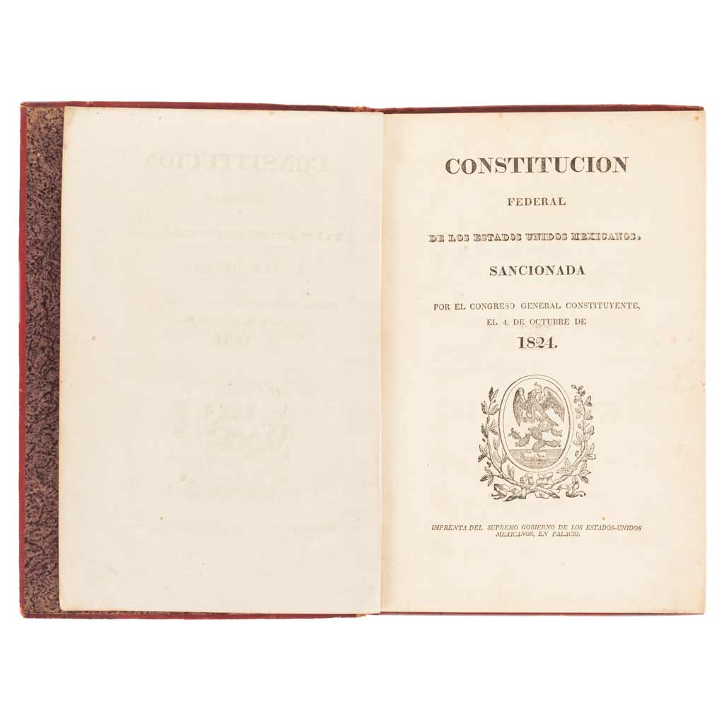 Subasta 957, Lote # 264 AC1824 - Primera Edición de la Primera Constitución Política de México. Guzmán, Juan. Constitución Federal de los Estados Unidos Mexicanos, Sancionada por el Congreso General Constituyente, el 4 de Octubre de 1824. México: Imprenta del Supremo Gobierno de los Estados Unidos Mexicanos, en Palacio, 1824. 4o. marquilla, Portada + 1 h. "Decreto" + 28 p. + índice. Primera edición. Decreto: "… El soberano Congreso general constituyente de los Estados unidos mexicanos á tenido á bien decretar. Sin perdida de tiempo procederá el gobierno á públicar solemnemente la Constitucion en esta capital, y la comunicará inmediatamente á los gobernadores de los estados y autoridades políticas de los territorios, para que asimismo lo verifiquen en todos los pueblos de su demarcacion… México 4 de Octubre de 1824…". Lomo rasgado en tercio superior; pastas desgastadas. Encuadernado en pasta dura, en piel. Porrúa de 1949 - 6448: "…la notabilísima Constitución de 4 de Octubre de 1824, primera completa que rigió a México independiente; primera manifestación también del triunfo de las ideas federalistas, reflejo el más fiel de la Constitución de los Estados Unidos del Norte en 1787, y del espíritu progresista o liberal, que encarnaba una de las tendencias que habían de vivir en sangrienta y encarnizada lucha hasta el triunfo de las ideas liberales…". Rodolfo Reyes. Prólogo a la Organización Política de México. Por Emilio Rabasa. Madrid (1919 (?)). Por su parte, en la obra del maestro Felipe Tena Ramírez "Leyes Fundamentales de México 1808-1973)": "… El 1o. de abril comenzó el Congreso a discutir el proyecto de Constitución Federativa de los Estados Unidos Mexicanos, que con modificaciones fue aprobado por la asamblea el 3 de octubre del mismo año de 1824 con el título de Constitución de los Estados Unidos Mexicanos, firmada el día 4 y publicada al siguiente por el Ejecutivo con el nombre de Constitución Federal de los Estados Unidos Mexicanos. La Constitución de 1824 estuvo en vigor hasta1835. Permaneció sin alteraciones hasta su abrogación…". Estimado $140,000-150,000