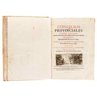 Subasta 961, Lote # 217 Lorenzana, Francisco Antonio. Concilios Provinciales Primero, y Segundo, Celebrados en la Muy Noble, y Muy Leal Ciudad de México, Presidiendo el Illmo. y Rmo. Señor D. Fr. Alonso de Montufar, en los años de 1555, y 1565. México: En la Imprenta del Superior Gobierno, 1769. 4o. marquilla, 4 h. + 396 p. Contiene: Primera Junta Apostólica; Constituciones del Arzobispado, y Provincia de México de la Nueva España. Concilio Primero. Con XCIII Capítulos; Ordenanzas; Arancel de los derechos; Derechos del alguacil y del alcalde; Sobre los Prelados; Series de los Illmos. Señores Prelados de la Provincia Mexicana; Avisos para la Acertada Conducta de un Párroco en la América, Avisos para que los Naturales de estos reynos sean felices en lo espiritual, y temporal. Con 8 grabados de Emanuel Villavicencio y uno de J. Navarro: Viñetas, capitulares y marmosetes. No hay pp. 39 - 40. Pequeños surcos de polilla en margen inferior pp. 297 - 306, no afecta texto. Encuadernado en pasta dura, en piel. Francisco Antonio de Lorenzana y Buitron (1722 - 1804) fue un Cardenal, liturgista y humanista español, que recogió y publicó las presentes Actas. En 1771 él mismo convoco al cuarto Concilio Provincial Mexicano. Cabe señalar que, en su devenir, también tiene cabida la historia profana, anotando prolija y eruditamente la Historia de la Nueva España, obra de Hernán Cortés. Los Concilios Provinciales eran reuniones solicitadas formalmente por el Arzobispo en donde se reunían todos los Obispos y autoridades competentes con el fin de discutir y acordar temas de relevancia para el funcionamiento de la Iglesia. Las primeras décadas de la conformación de la Nueva España resultaron complejas para la iglesia ya que esta vivía cambios internos, esto, aunado a las problemáticas sociales de la época y a la necesidad de expandir la religión por el nuevo territorio, dio como resultado la necesidad de convocar para 1555 el primer concilio provincial, años más tarde, en 1565 el Arzobispo, Fray Alonso de Montúfar convoca el segundo concilio provincial, en donde se jura obediencia y suscripción al Concilio de Trento; para la segunda mitad del Siglo XVIII los manuscritos originales de estos concilios se encontraban en la Catedral por lo que en 1769 el Arzobispo Francisco Antonio de Lorenzana decide hacer una edición, incluyendo ambos concilios. Véase en: www.historicas.unam.mx/publicaciones/publicadigital/libros/concilios. Estimado $12,000-14,000