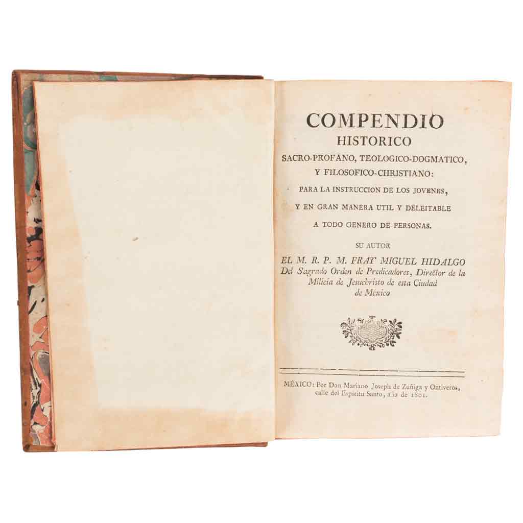 Hidalgo, Miguel. Compendio Histórico Sacro - Profano, Teológico - Dogmático, y Filosófico - Christiano. Para la Instrucción de los Jóvenes, y en gran manera útil y deleitable a todo género de personas. México: Por Don Mariano de Zúñiga y Ontiveros, 1801. 8o. marquilla, 8 h. + 481 p. + 2 h. Encuadernado en pasta dura, en piel. Palau: 114625