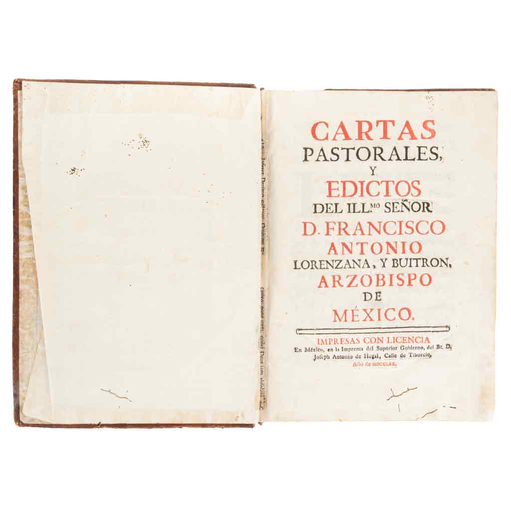 Lorenzana y Buitrón, Francisco Antonio. Cartas Pastorales y Edictos del Illmo. Señor Arzobispo de México. México: En la Imprenta del Superior Gobierno del Br. D. Jofeph Antonio de Hogal, 1770. 4o. marquilla, 12 h. + 229 p. Textos destacados Pastoral V "Para que los indios aprendan castellano" (pp. 91-100) y la "Oración a Nuestra Señora de Guadalupe" (pp. 195-216). Surcos de polilla en margen inferior. Encuadernado en pasta dura, en piel.