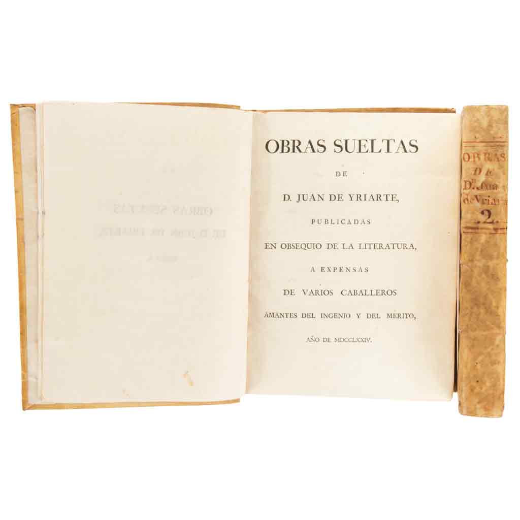 Yriarte, Juan de. Obras Sueltas. Madrid: En la Imprenta de D. Francisco Manuel de Mena, 1774. 4o. marquilla, 24 h. + 504 p.; 512 p. Publicadas en obsequio de la literatura a expensas de Varios Caballeros amantes del Ingenio y del Mérito. Encuadernados en pergamino. Piezas: 2. Estimado $6,000-8,000