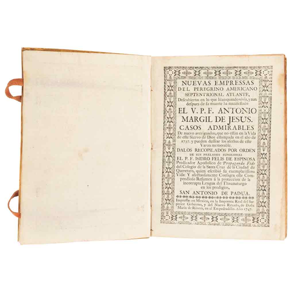 Espinosa, Isidro Felis. Nuevas Empressas del Peregrino Americano Septentrional Atlante, defcubiertas en lo que hizo quando vivia, y aun defpues de fu muerte ha manifeftado el V. P. F. Antonio Margil de Jesús. México: En la Imprenta Real de Superior Gobierno y del Nuevo Rezado, de Doña María de Rivera, 1747. 8o. Marquilla, 11 h. + 46 p. Casos admirables de nuevo averiguados, que no eftan en la Vida de efte Siervo de Dios eftampada en el año de 1737 y pueden deffear los afectos de efte Varon memorable. Portada orlada. Mancha en punta superior. Encuadernado en pergamino. Estimado $8,000-10,000