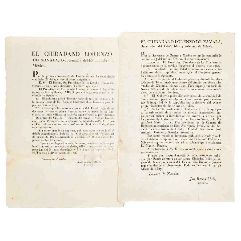 Subasta 961, Lote # 145 Zavala, Lorenzo de - Malo, José Ramón. Bandos. El Gobierno Podrá Disponer de Hombres de la Milicia. a) "Art. 1o. Se faculta al Gobierno para que durante los desórdenes de Tejas, pueda usar dentro del círculo que forman los estados de Coahuila, Nuevo León, Tamaulipas, y territorio de Nuevo México, de la milicia local de los mismos, hasta en número de cuatro mil hombres… Dado en Texcoco a 12 de Marzo de 1827.". Una hoja, 31.3 x 21.4 cm. Surcos de polilla, rasgadura y faltantes en tercio inferior; surcos de polilla en tercio medio y faltante en punta superior izquierda, restaurados, afecta poco texto. b) "1o. El gobierno podrá disponer hasta de tres mil hombres de la milicia local de los Estados limítrofes al de Durango para la pacificación de éste. 2o. Hasta que los supremos poderes del Estado referido no declaren hallarse en plena libertad para el ejercicio de sus funciones, no serán válidas, ni deberán tener efecto sus providencias… Dado en Tezcoco á 29 de Marzo de 1827.". Una hoja, 31.6 x 21.6 cm. Surcos de polilla, rasgadura y faltantes en tercio inferior; surcos de polilla en tercio medio, restaurados, afecta poco texto. Total de piezas: 2. Estimado $10,000-12,000
