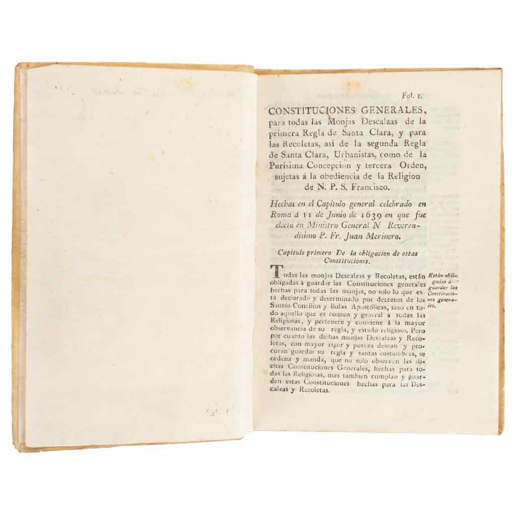 8o. marquilla, 44 p. Constituciones Generales para todas las Monjas Descalzas de la primera Regla de Santa Clara, y para las Recolectas, así de la segunda Regla de Santa Clara, Urbanistas, como de la Purísima Concepción y tercera Orden, sujetas a la obediencia de la Religión de N. P. S. Francisco. Encuadernado en pergamino.