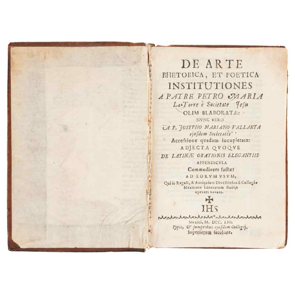 Subasta 961, Lote # 169 Vallarta, Mariano. De Arte Rhetorica, et Poetica Institutiones Patre Petro Maria. Mexici: Typis & fumptibus ejufdem Collegij, 1753. 16o. marquilla, 1 h. + 192 + 91 p. + 2 h. Accefsione quadam locupletatae: Adjecta quoque de Latine Orationis Elegantiis. Appendicula Commodiores factae ad Eorumsum, qui in Regali & Sntiquioris Divilldefon fi Collegio Mexicano Litterarum ftudijs operam navant. Páginas: 1-2, 67-68 y 81-82 (2a. parte), con recorte al centro de media caña, última hoja con recorte en margen inferior. Falto de cofia y pie, cajo anterior quebrado. Encuadernado en pasta dura, en piel. Estimado $8,000-10,000