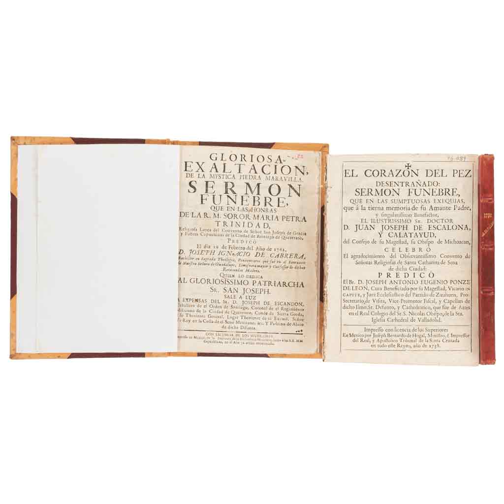 Subasta 961, Lote # 205 Cabrera, Joseph Ignacio de / Ponze de León, Antonio Eugenio / Vizcarra, Joseph Appolinari. Sermones Fúnebres. a) Cabrera, Joseph Ignacio. Gloriosa Exaltación de la Mystica Piedra Maravilla. Sermón Fúnebre, que en Honras de la R. M. Soror María Petra Trinidad, Religiosa Layca del Convento de Señor San Joseph de Gracia y Pobres Capuchinas de la Ciudad de Querétaro. México: En la Imprenta de la Bibliotheca Mexicana, 1762. 8o. marquilla, 10 h. + 35 p. Surcos de polilla en margen externo, tercio inferior; media caña deteriorada. Encuadernado en pasta dura, lomo y puntas en piel. b) Ponze de León, Antonio Eugenio. El Corazón del Pez Desentrañado: Sermón Fúnebre, que en las Sumptuosas Exequias, que a la Tierna Memoria de fu Amante Padre, y fingulariffimo Benefactor, el Ilustrissimo Sr. Doctor D, Juan Joseph de Escalona y Calatayud, del Confejo de fu Mageftad, fu Obifpo de Michoacán. México: Por Jofeph Bernardo de Hogal, 1738. 8o. marquilla, 7 h. + 28 p. Dos grabados. Encuadernado sin pastas. c) Vizcarra, Joseph Appolinari - Moreno, Juan Joseph. Elogios Fúnebres con que la Santa Iglesia Catedral de Guadalaxara ha Celebrado la Buena Memoria de su Prelado el Ilmo. y Rmo. Señor Mtro. D. Fr. Antonio Alcalde. Guadalaxara: En la Imprenta de Don Mariano Valdés Tellez Girón, 1793. 8o. marquilla, 2 h. + XXVIII + 1 h. + 48 p. + 1 h. Perforaciones por polilla, afecta poco el texto; media caña manchada. Encuadernado en pasta dura, lomo en piel. Total de piezas: 3. Estimado $12,000-14,000