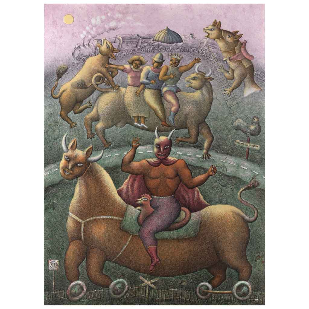 MAXIMINO JAVIER (Santa Fe la Mar, Valle Nacional, Oaxaca, 1948 - ) El Regreso de Belcebú, de la suite La aventura de Belcebú Firmada y fechada 83 Litografía 34 / 100 Con sello de agua de Kyron Ediciones Gráficas Limitadas. Impresa por Kyron Ediciones Gráficas Limitadas. 76 x 56 cm Estimado $12,000-20,000