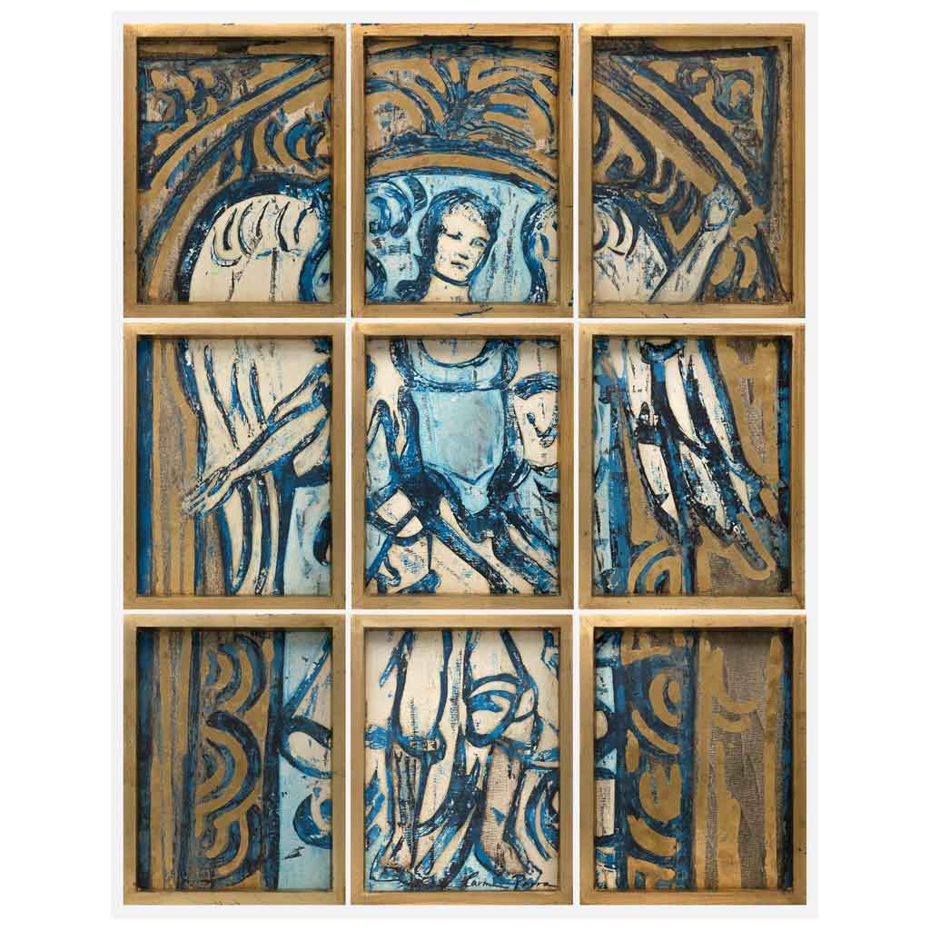 CARMEN PARRA (Ciudad de México, 1944 - ) San Miguel Arcángel (A partir de Georges Rouault) Firmada Colografía con aplicación de oro (collage entintado e impreso) Piezas: 9 Con constancia de autenticidad de El Aire Centro de Arte firmada por la artista. 42 x 32 cm cada una 127 x 97 cm medidas totales Estimado $36,000-44,000