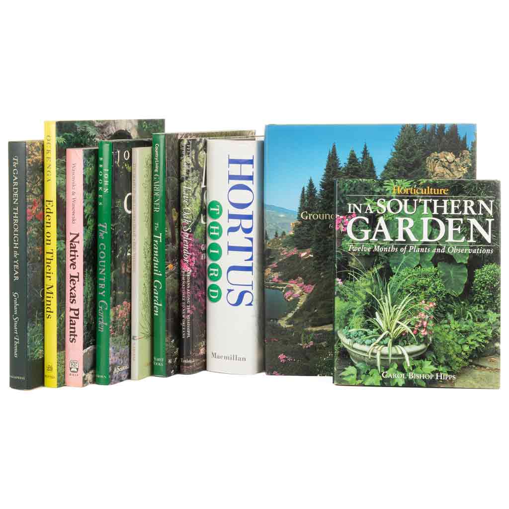 Subasta 966, Lote # 20 AA - Jardinería del Sur de Estados Unidos. a) Bishop Hipps, Carol. Horticulture in a Southern Garden: Twelve Months of Plants and Observations. New York: Macmillan, 1995. 4o. marquilla, 229 p. Encuadernado en pasta dura. b) Webster, Bob. The South Texas Garden Book. San Antonio, Texas: Corona Publishing Company, 1980. 4o. marquilla, 1 h. + 127 p. Encuadernado en rústica. c) Hyde Bailey, Liberty - Bailey, Ethel Zoe (Compiladores). Hortus Third: A Concise Dictionary of Plants Cultivated in the United States and Canada. New York: Macmillan, 1976. 4o. marquilla, XIV + 1290 p. Encuadernado en pasta dura. d) Fairfax, Kay - Nichols, Clive. The Tranquil Garden: Creating Peaceful Spaces Outdoors. New York: Hearst Books, 1999. 4o. marquilla, 192 p. Primera edición. Encuadernado en pasta dura. e) Brookes, John. The Country Garden. New York: Crown Publishers, Inc., 1987. 4o. marquilla, 224 p. Encuadernado en pasta dura. f) Feltwell, John - Odenwald, Neil. Live Oak Splendor: Gardens Along the Mississippi from Natchez to New Orleans. Dallas, Texas: Taylor Publishing Company, 1992. 4o. marquilla, IX + 182 p. Encuadernado en pasta dura. g) Wasowski, Sally - Wasowski, Andy. Native Texas Plants. Houston, Texas: Gulf Publishing Company, 1991. 4o. marquilla, XXI + 406 p. Encuadernado en rústica. h) Thomas, Graham Stuart. The Garden Through the Year. New York: Sagapress, 2002. 4o. marquilla, XXI + 302 p. Encuadernado en pasta dura. i) Ockenga, Starr. Eden in their Minds: American Gardeners with Bold Visions. New York: Clarkson Potter / Publishers, 2001. 4o. marquilla, 240 p. Primera edición. Encuadernado en pasta dura. j) Otis, Denise. Grounds for Pleasure: Four Centuries of the American Garden. New York: Harry N. Abrams, Inc., 2002. 4o. marquilla, 352 p. Encuadernado en pasta dura. Total de piezas: 10. Estimado $2,000-3,000