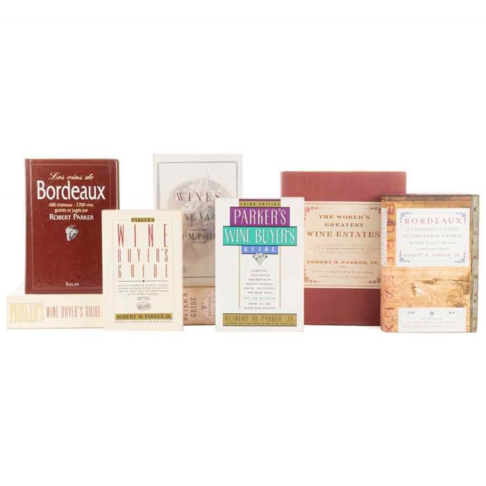 Subasta 966, Lote # 186 EB - Parker, Robert M., Jr. Guías sobre Vinos. a) The World's Greatest Wine States: A Modern Perspective. New York: Simon & Schuster, 2005. 4o. marquilla, 3 h. + 708 p. Firmado por el autor. Encuadernado en pasta dura. b) Wine Buyer's Guide. New York: Simon & Schuster, 1987. 8o. marquilla, 731 p. Encuadernado en rústica. c) Wine Buyer's Guide. New York: Simon & Schuster, 1999. 4o., 1703 p. Encuadernado en rústica. d) Les Vins de Bordeaux. Paris: Éditions Solar, 1993. 4o. marquilla, 1118 p. Encuadernado en pasta dura. e) Wines of the Rhône Valley. New York: Simon & Schuster, 1997. 4o. marquilla, 685 p. Firmado por autor. Encuadernado en pasta dura. f) Wine Buyer's Guide. New York: Simon & Schuster, 2008. 4o. marquilla, XXI + 1513 p. Encuadernado en pasta dura. g) Wine Buyer's Guide. New York: Simon & Schuster, 1994. 4o., 1158 p. Encuadernado en rústica. h) Bordeaux: A Consumer's Guide to the World's Finest Wines. New York: Simon & Schuster, 2003. 4o. marquilla, XX + 1244 p. Encuadernado en pasta dura. Total de piezas: 8. Estimado $2,000-3,000