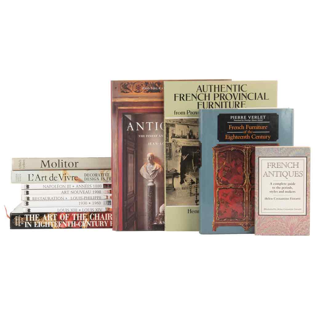 Subasta 966, Lote # 90 CA - Diseño de Interiores en Francia. a) Costantino Fioratti, Helen. French Antiques: A Complete Guide to the Periods, Styles and Makers. New York: The Antiquaire and the Connoisseur, Inc., 1990. 8o. marquilla, 256 p. + 8 h. (ilustraciones intercaladas en el texto). Encuadernado en rústica. b) Verlet, Pierre. French Furniture of the Eighteenth Century. Charlottesville / London: University Press of Virginia, 1991. 4o. marquilla, XV + 256 p. + 44 h. (ilustraciones intercaladas en el texto). Encuadernado en pasta dura. c) Nouvel-Kammerer, Odile / Quette, Anne-Marie / Leris-Laffargue, Janine / Brunhammer, Yvonne. Collection: Le Mobilier Français. Paris: Éditions Massin, 1994 - 1997. 4o. marquilla, 93; 93; 93; 165; 93 p. "Napoléon III, Années 1880", "Art Nouveau, 1900", "Restauration Louis - Phillippe", "1930 - 1960", "Louis XIII, Louis XIV". Encuadernados en pasta dura. Piezas: 5. d) Algoud, Henri - LeClerc, Léon - Banéat, Paul. Authentic French Provincial Furniture from Provence, Normandy and Brittany. New York: Dover Publications, Inc., 1993. 4o. marquilla, 124 p. Encuadernado en rústica. e) Gaillemin, Jean-Louis. Antiquaires: The Finest Antique Dealers in Paris. New York: Assouline, sin fecha. 4o. marquilla, 230 p. Encuadernado en pasta dura. f) Leben, Ulrich. Molitor: Ébéniste from the Ancien Régime to the Bourbon Restoration. London: Philip Wilson Publishers Limited, 1992. 4o. marquilla, 247 p. Encuadernado en pasta dura. g) Varios Autores. L'Art de Vivre: Decorative Arts and Design in France, 1789 - 1989. New York: The Vendome Press, 1989. 4o. marquilla, 255 p. Encuadernado en pasta dura. h) Pallot, Bill G. B. The Art of the Chair in Eighteenth - Century France. Paris: ACR - Gismondi Éditeurs, 1989. 4o. marquilla, 332 p. Encuadernado en pasta dura. Total de piezas: 12. Estimado $3,000-4,000