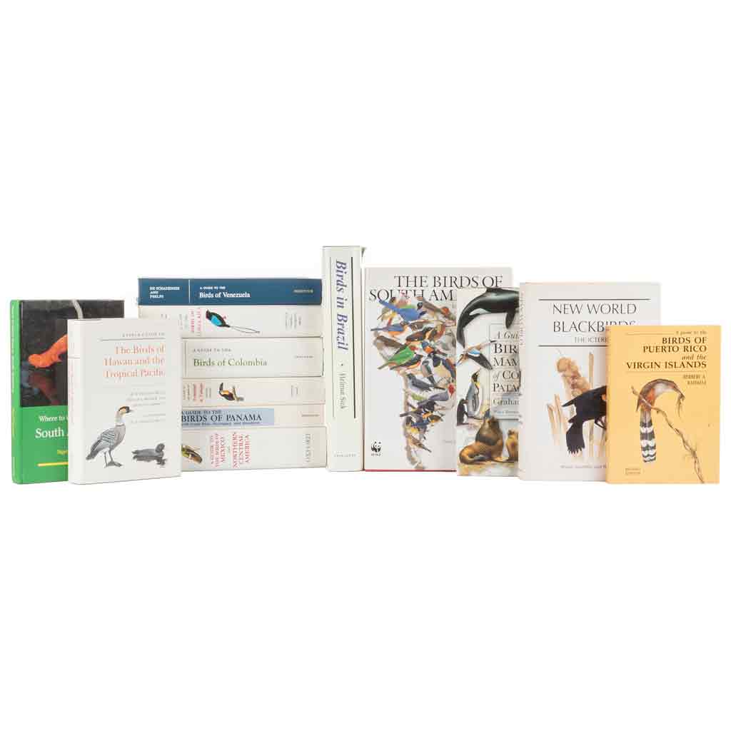 Subasta 966, Lote # 66 BB - Libros sobre Aves de América. a) Raffaele, Herbert A. A Guide to the Birds of Puerto Rico and the Virgin Islands. New Jersey: Princeton University Press, 1989. 8o. marquilla, 254 p. + 45 h. Ilustrado. Encuadernado en rústica. b) Meyer de Schauensee, Rodolphe - Phelps Jr., William H. A Guide to the Birds of Venezuela. New Jersey: Princeton University Press, 1978. 4o. marquilla, 424 p. + 56 h. Ilustrado. Encuadernado en pasta dura. c) Wheatley, Nigel. Where to Watch Birds in South America. New Jersey: Princeton University Press, 1995. 8o. marquilla, 431 p. Ilustrado. Encuadernado en pasta dura. d) Ffrench, Richard. A Guide to the Birds of Trinidad & Tobago. New York: Ithaca, 1991. 8o. marquilla, XVII + 426 p. + 18 h. Segunda edición. Ilustrado por John P. O'Neill y Don R. Eckelberry. Encuadernado en pasta dura. e) Ridgely, Robert S. - Gwynne, Jr., John A. A Guide to the Birds of Panama with Costa Rica, Nicaragua, and Honduras. New Jersey: Princeton University Press, 1989. 4o., 534 p. + 50 h. Ilustrado. Encuadernado en rústica. f) Ridgely, Robert S. - Tudor, Guy. The Birds of South America. The Oscine Passerines. Austin: University of Texas Press, 1989. 4o. marquilla, XVI + 516 p. + 32 h. Primera edición. Ilustrado. Encuadernado en pasta dura. g) Hilty, Steven L. - Brown, William L. A Guide to the Birds of Colombia. New Jersey: Princeton University Press,1986. 4o. marquilla, XII + 836 p. + 35 h. Ilustrado. Encuadernado en pasta dura. h) Stiles, F. Gary - Skutch, Alexander F. A Guide to the Birds of Costa Rica. New York: Ithaca, 1989. 4o. marquilla, IX + 511 p. + 52 h. Ilustrado por Dana Gardner. Encuadernado en pasta dura. i) Pratt, H. Douglas - Bruner, Phillip L. - Berrett, Delwyn G. A Field Guide to the Birds of Hawaii and the Tropical Pacific. New Jersey: Princeton University Press, 1987. 8o. marquilla, XX + 410 p. + 46 h. Ilustrado por H. Douglas Pratt. Encuadernado en pasta dura. j) Sick, Helmut. Birds in Brazil. A Natural History. New Jersey: Princeton University Press, 1993. 4o. marquilla, XVII + 703 p. + 25 h. Ilustrado por Paul Barruel y John P. O'Neil. Encuadernado en pasta dura. k) Howell, Steve N. G. - Webb, Sophie. A Guide to the Birds of Mexico and Northern Central America. Oxford: Oxford University Press, 1995. 4o. marquilla, XVI + 851 p. + 72 h. Ilustrado. Encuadernado en pasta dura. l) Jaramillo, Alvaro - Burke, Peter. New World Blackbirds. The Icterids. New Jersey: Princeton University Press, 1999. 4o. marquilla, 431 p. Ilustrado. Encuadernado en pasta dura. m) Harris, Graham. A Guide to the Birds and Mammals of Coastal Patagonia. New Jersey: Princeton University Press, 1998. 4o., XVIII + 231 p. + 33 h. Ilustrado por el autor. Prefacio de William Conway. Encuadernado en pasta dura. Total de piezas: 13. Estimado $2,000-3,000