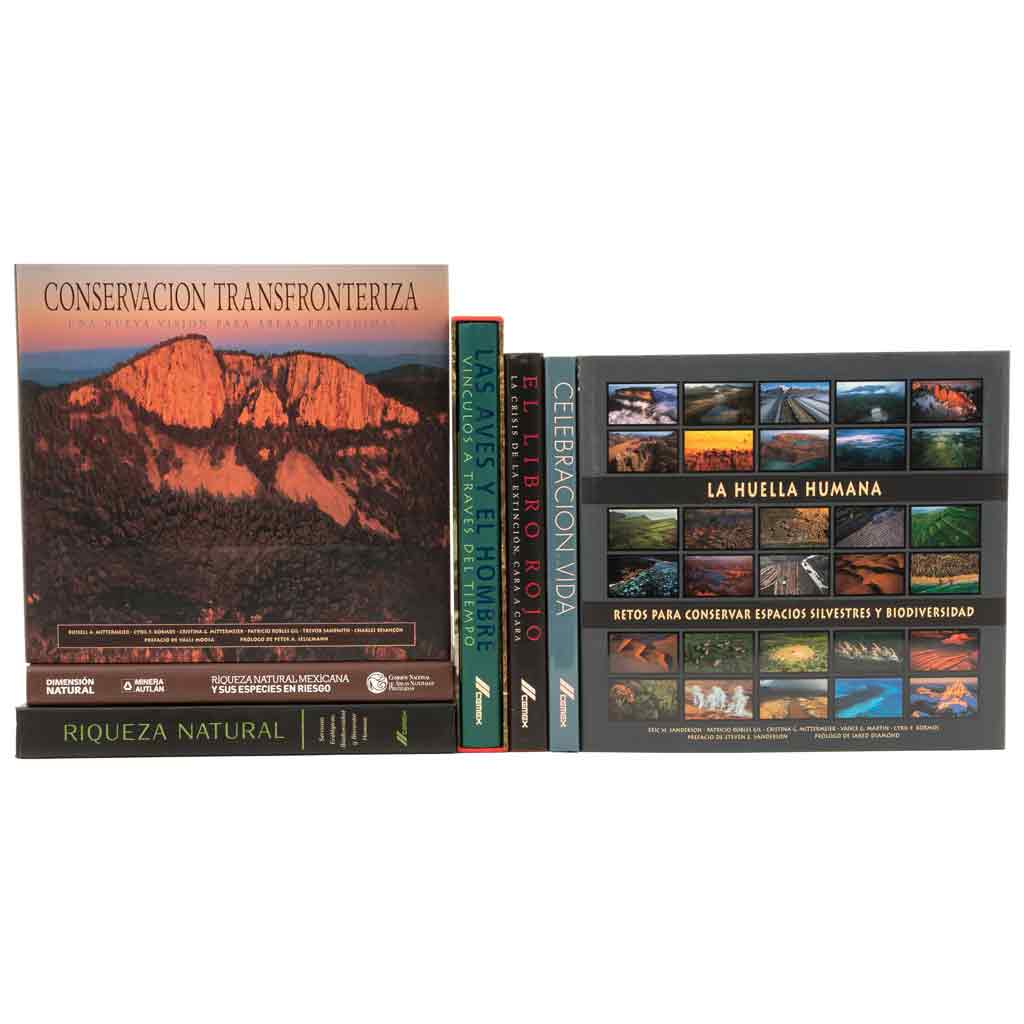 Subasta 966, Lote # 53 BA - Conservación de la Riqueza Natural. a) Gibert Isern, Santiago - Infante Mercado, Oscar - Narro Etchegaray, Ignacio. Riqueza Natural Mexicana y sus Especies en Riesgo. México: Dimensión Natural, 2010. 4o. marquilla apaisado, XXII + 287 p. Encuadernado en pasta dura. b) Bräutigam, Amie - Jenkins, Martin D. El Libro Rojo: La Crisis de la Extinción Cara a Cara. México: CEMEX, 2001. 4o. marquilla apaisado, 309 p. Encuadernado en pasta dura. c) Collar, Nigel J. - Long, Adrian J. - Robles Gil, Patricio - Rojo, Jaime. Las Aves y el Hombre: Vínculos a través del Tiempo. México: CEMEX, 2007. 4o. marquilla apaisado, 360 p. Primera edición. Dedicado por Patricio Robles Gil a Lorenzo Zambrano. Encuadernado en pasta dura, en estuche. d) Robles Gil, Patricio. Celebración a la Vida: Testimonios de un Compromiso. México: CEMEX, 1996. 4o. marquilla apaisado, 208 p. Primera edición. Encuadernados en pasta dura. e) Sanderson, Eric W. - Robles Gil, Patricio - Mittermeier, Cristina G. - Martin, Vance G. - Kormos, Cyril F. La Huella Humana: Retos para Conservar Espacios Silvestres y Biodiversidad. México: CEMEX, 2006. 4o. marquilla apaisado, 324 p. Primera edición. Encuadernado en pasta dura. f) Varios Autores. Conservación Transfronteriza: Una Nueva Visión para Áreas Protegidas. México: CEMEX, 2005. 4o. marquilla apaisado, 372 p. Primera edición. Encuadernado en pasta dura. g) Varios Autores. Riqueza Natural: Servicios Ecológicos, Biodiversidad y Bienestar Humano. México: CEMEX, 2009. 4o. marquilla, 6 h. + 366 p. Primera edición. Encuadernado en pasta dura. Total de piezas: 7. Estimado $2,000-3,000