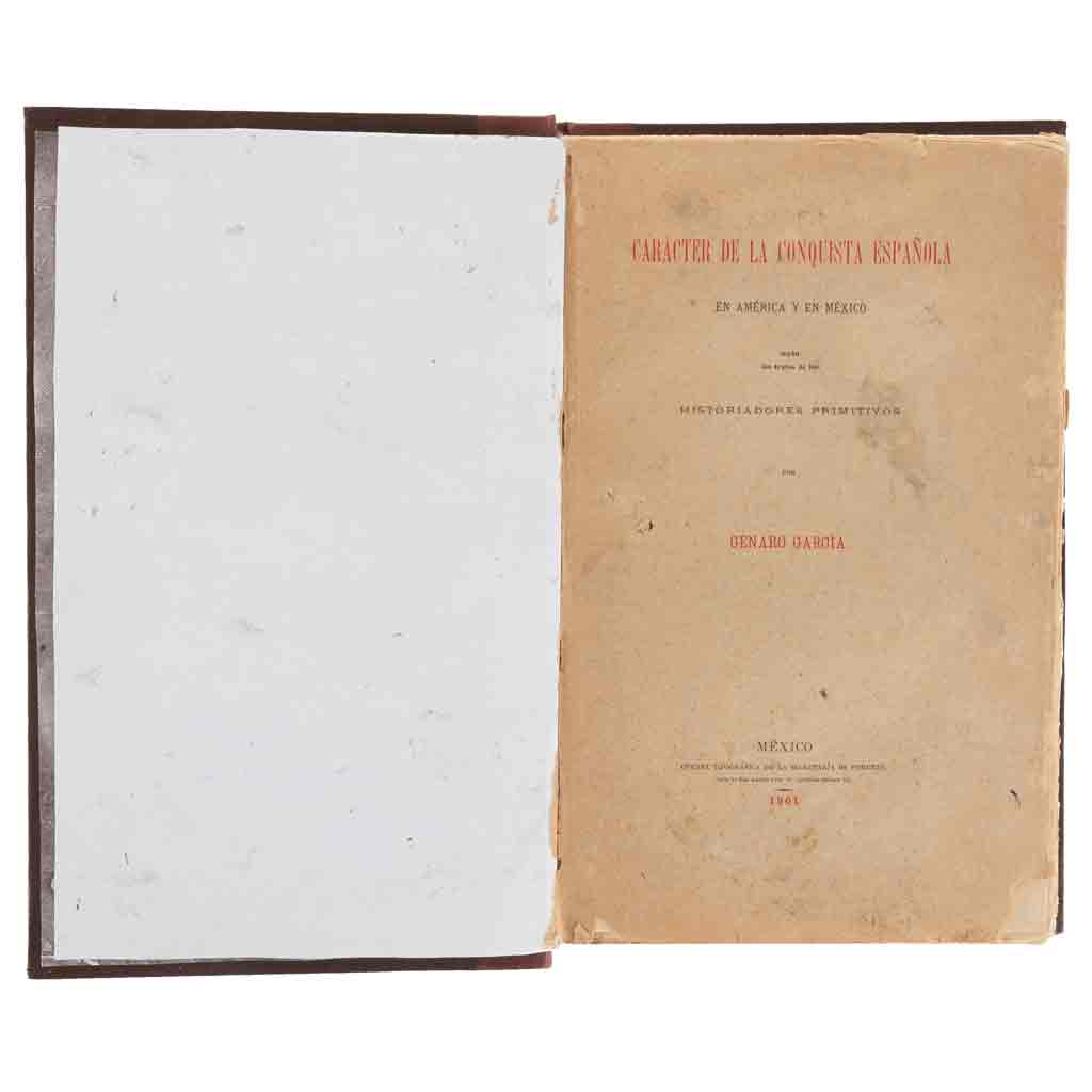 García, Genaro. Carácter de la Conquista Española en América y en México Según los Textos de los Historiadores Primitivos. México: Oficina Tipográfica de la Secretaría de Fomento, 1901. 4o. marquilla, 456 p. Intonso. Conserva pastas originales en rústica, con faltantes. Encuadernado en pasta dura, lomo en piel. Palau: 97987. "Bella publicación con motivo del XIII Congreso de Americanistas. Edición de 500 ejemplares".