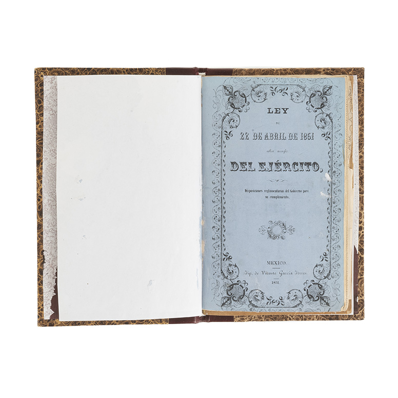 Arista, Mariano.Ley de 22 de Abril de 1851 sobre Arreglo del Ejército y Disposiciones Reglamentarias del Gobierno para su Cumplimiento. México: Tip. de Vicente García Torres, 1851. 8o. marquilla, 11 h. 12 cuadros (cinco plegados). Conserva pasta anterior original en rústica. Texto refinado. Encuadernado en pasta dura, lomo en piel. Estimado $2,000-3,000