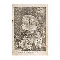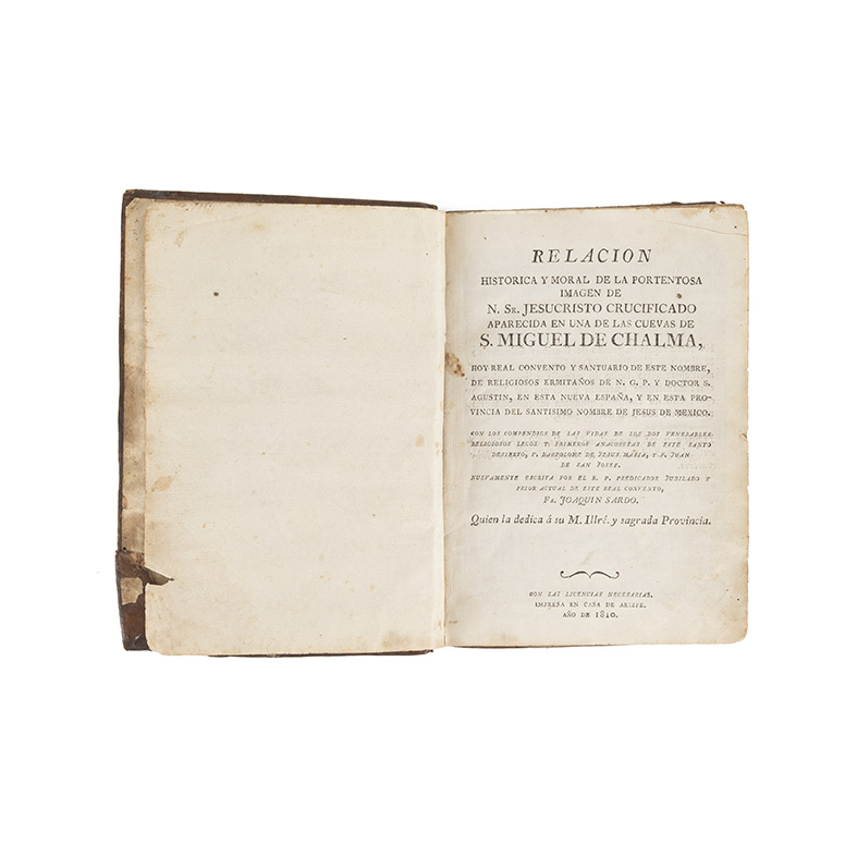 Subasta 1004, Lote # 173 Sardo, Joaquín. Relación Histórica y Moral de la Portentosa Imagen de N. Sr. Jesucristo Crucificado Aparecida en una de las Cuevas de S. Miguel de Chalma, Hoy Real Convento y Santuario de este Nombre, de Religiosos Ermitaños de N. G. P. y Doctor S. Agustín, en esta Nueva España, y en esta Provincia del Santísimo Nombre de Jesús de México. México: Casa de Arizpe, 1810. 8o. marquilla, 7 h. + 386 p. + lámina "Aparición del Santo Christo de Chalma". Incluye: 'Compendios de las Vidas de los Dos Venerables Religiosos Legos y Primeros Anacoretas de este Santo Desierto, F. Bartolomé de Jesús María, y F. Juan de San Josef'. Páginas con ligero daño por humedad y óxido. Pasta con doblez marcado en la punta inferior. Encuadernado en pasta dura, en piel. Palau: 302085. La cueva en Chalma fue un sitio de veneración desde antes de la llegada de los españoles, durante el período virreinal y con la aparición de la imagen de Cristo -acontecimiento descrito en el texto-, este lugar se convierte en uno de los lugares más visitados en peregrinación, junto con la Basílica a la Virgen de Guadalupe, por lo menos en el centro del territorio de la entonces Nueva España. Las biografías que se añaden son de dos personajes que ayudaron a la conservación del santuario de Chalma. Estimado $8,000-10,000