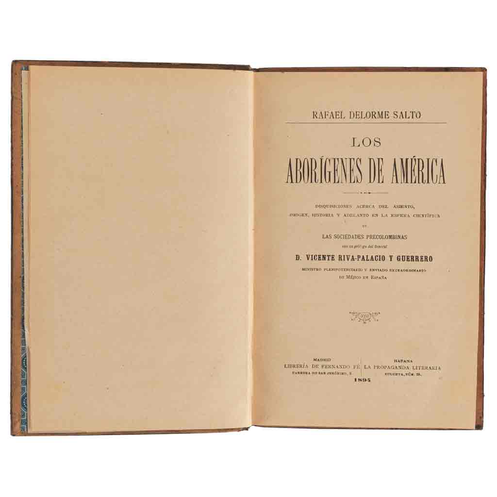 Delorme Salto, Rafael.Los Aborígenes de América. Disquisicones acerca del Asiento, Origen, Historia y Adelanto en la Esfera Científica de las Sociedades Precolombinas. Madrid - Habana: Librería de Fernando Fé - La Propaganda Literaria, 1894. 8o. marquilla, XVI + 230 p. + 1 h. Prólogo de Vicente Riva - Palacio y Guerrero. Encuadernación de J. Ballesca y Cía. Encuadernado en pasta dura, en piel. Estimado $6,000-8,000