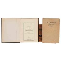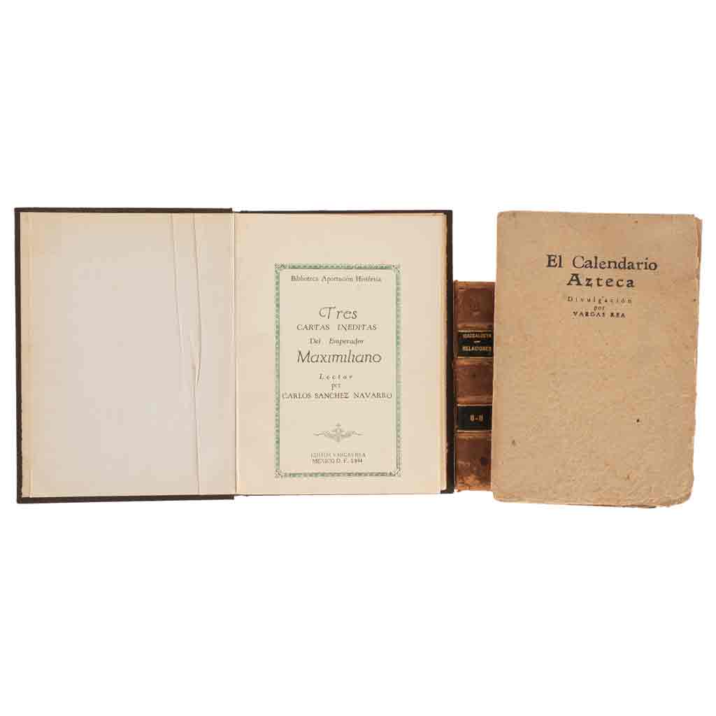 Subasta 986, Lote # 228 Vargas Rea (Editor). El Calendario Azteca / Biblioteca Aportación Histórica / Relaciones Copiadas por el Sr. Icazbalceta. a) El Calendario Azteca. 8o., 13 p. Página 13 plegada con ilustración del Calendario azteca, reforzada en doblez y mancha de humedad. Encuadernado en rústica. b) Sánchez Navarro, Carlos (Lector). Tres Cartas Inéditas del Emperador Maximiliano. México, 1944. 8o. marquilla, 40 p. + 1 h. Biblioteca Aportación Histórica. Edición de 100 ejemplares numerados, ejemplar número 12. Conserva pasta anterior original en rústica. c) Carta de Hernán Cortes… a su Pariente y Procurador, el Licenciado Francisco Núñez. México 25 Junio de 1532. México, 1944. 8o. marquilla, II + 33 p. Biblioteca Aportación Histórica. Edición de 100 ejemplares numerados, ejemplar número 64. Conserva pasta anterior original en rústica. Primera vez que se publica íntegra, con la versión paleográfica del Padre Mariano Cuevas y Francisco Monterde García Icazbalceta (sobrino nieto de Joaquín García Icazbalceta). d) Aguilar, Francisco de. Relato Breve de la Conquista de la Nueva España. México, 1944. 8o. marquilla, 73 p. Biblioteca Aportación Histórica. Edición de 100 ejemplares numerados, ejemplar número 18. Conserva pasta anterior original en rústica. Fue copiado por Francisco del Paso y Troncoso durante su permanencia en España en 1892, tomado de los originales que obran en la Biblioteca del Escorial. Se dio a conocer en el volumen VII de los "Anales del Museo Nacional" 1903. e) Ruiz, Hernán Gra. Relación de Acapistla. México, 1956. 8o., 44 p. Del volumen I de Relaciones Copiadas por el Sr. Icazbalceta, del Siglo XVI. Edición de 75 ejemplares numerados, ejemplar sin numerar. f) Solís, Gaspar de. Descripción de Atlatlauca. México, 1957. 8o., 49 p. Del volumen I de Relaciones Copiadas por el Sr. Icazbalceta, del Siglo XVI. Edición de 50 ejemplares numerados, ejemplar número 13. g) Gaspar de... Relación de Iztapalapan. México, 1957. 8o., 26 p. Del volumen I de Relaciones Copiadas por el Sr. Icazbalceta, del Siglo XVI. Edición de 50 ejemplares numerados, ejemplar sin numerar. h) Gutiérrez de Verdiga, Pedro. Descripción de Antequera. México, 1957. 8o., 41 p. Del volumen I de Relaciones Copiadas por el Sr. Icazbalceta, del Siglo XVI. Edición de 50 ejemplares numerados, ejemplar número 12. Siete obras encuadernadas en dos volúmenes, un volumen con cajos quebrados. Encuadernados en pasta dura. Total de piezas: 3. Estimado $7,000-9,000