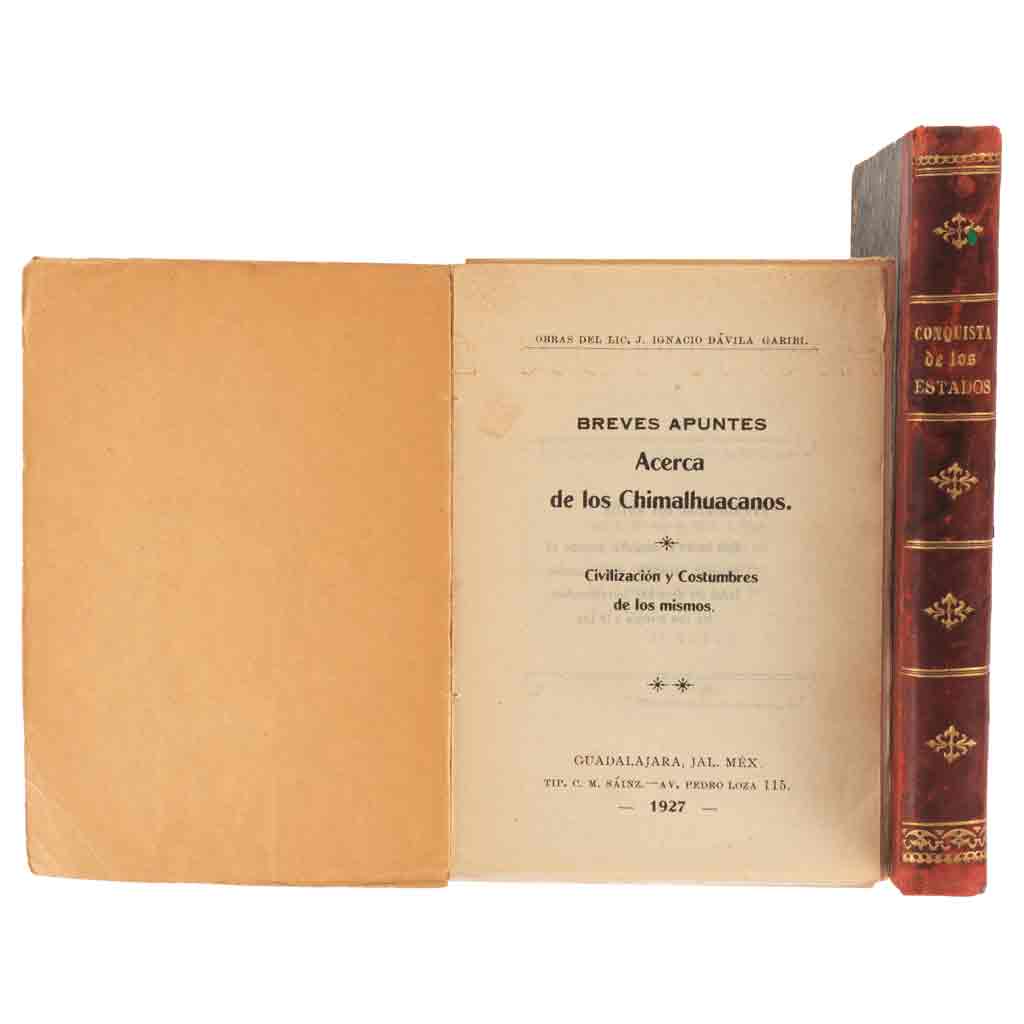 Subasta 986, Lote # 184 Frejes, Francisco / Dávila Garibi, Ignacio. Historia Breve de la Conquista de los Estados Independientes del Imperio Mexicano / Breves Apuntes acerca de los Chimalhuacanos. a) Frejes, Francisco. Historia Breve de la Conquista de los Estados Independientes del Imperio Mexicano. Guadalajara: Tip. de S. Banda, 1878. 8o. marquilla, 277 + 2 p. Edición del "Estado de Jalisco". Sellos de antigua biblioteca. Encuadernado en pasta dura, lomo en piel. b) Dávila Garibi, Ignacio. Breves Apuntes acerca de los Chimalhuacanos Civilización y Costumbres de los Mismos. Guadalajara: Tip. C. M. Sáinz, 1927. 8o. marquilla, XVI + 321 p. Ilustrado con retrato del autor y seis láminas. Semi intonso. Encuadernado en rústica. Total de piezas: 2. Estimado $6,000-8,000