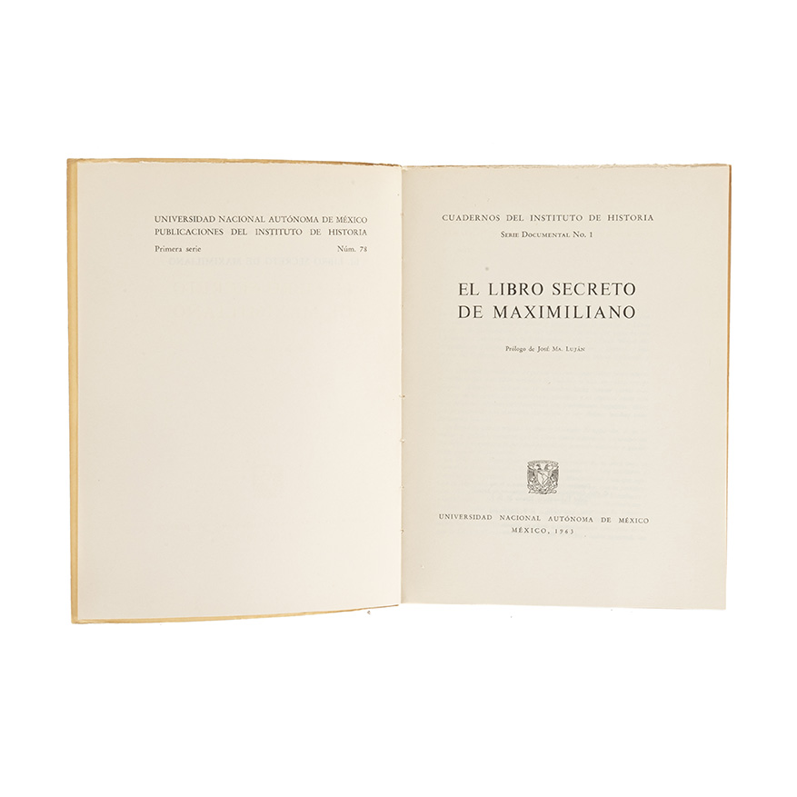 Obra que Complementa a la Impresa en 1867 Titulada "Los Traidores Pintados por Sí Mismos". El Libro Secreto de Maximiliano. México: Universidad Nacional Autónoma de México, 1963. 8o. marquilla, 126 p. + 2 h. Prólogo de José María Luján. Primera edición. Edición de 1,500 ejemplares. Encuadernado en rústica.