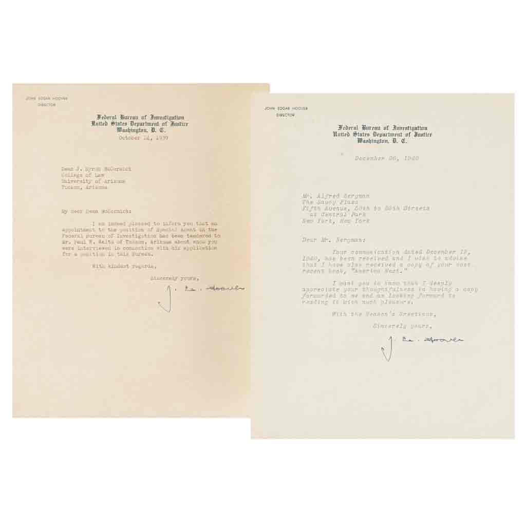 Subasta 986, Lote # 232 Hoover, John Edgar. Cartas. Washington D. C., 1939 / 1940. a) Carta a Dean McCormick. Washington D. C., octubre 24 de 1939. "I am indeed pleased to inform you that an appointment to the position of Special Agent in the Federal Bureau of Investgation has been tendered to Mr. Paul W. Waltz of Tucson, Arizona about whom you were interviewed in connection with his application for a position in this Bureau". Firma. Con membrete del Federal Bureau of Investigation United States Departament of Justice. 1 h., 23.5 x 18 cm. b) Carta a Mr. Alfred Bergman. Washington D. C., diciembre 26 de 1940. "Your communication dated December 12, 1940, has been received and I wish to advise that I have also received a copy of your most recent book, 'America Next'...". Firma. Con membrete del Federal Bureau of Investigation United States Departament of Justice. 1 h., 23.5 x 18 cm. Total de piezas: 2. John Hoover (1895 - 1972), fue el primer director de la Oficina de Investigación de los Estados Unidos, antecesora del FBI fundado en 1935, y donde fue director durante 37 años. Cuando asumió el cargo, Hoover heredó una estructura plagada de corruptelas e ineficiencia. Fundada el 26 de julio de 1908 a instancias del presidente Roosevelt, la entonces conocida como Oficina de Investigación (BOI, en sus siglas inglesas) se limitaba inicialmente a tres decenas de agentes especiales dedicados a la lucha contra la trata de blancas. Cuando Hoover murió contaba con más de 5000 agentes y era uno de los ejes del poder norteamericano. Su lema: Fidelidad, Valentía, Integridad (palabras cuyas iniciales coinciden, en inglés, con la sigla FBI). Pero el Director no siempre siguió sus estrictas reglas morales, lo cual se dio a conocer después de su muerte. Véase en: Méndez, Daniel. La historia secreta del FBI, en XLSemanal. Estimado $5,000-7,000