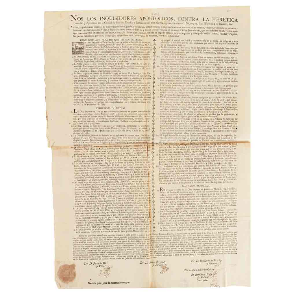 Subasta 986, Lote # 200 Mier y Villar, Juan de - Bergosa y Jordán, Antonio - Prado y Obejero, Bernardo de. Edicto sobre Libros Prohibidos. México, julio 28 de 1797. Rúbricas de Juan de Mier y Villar, Antonio Bergosa y Jordán, Bernardo de Prado y Obejero y Bernardo Ruiz, como secretario del Santo Oficio. Sello del Santo Oficio. 1 h., 59 x 41.2 cm. La prohibición se divide en tres categorías: Los libros prohibidos aun para los que tienen licencia, Prohibidos in totum y los mandados a expurgar. En el primer rubro se enlistan cinco obras, en el segundo, 21 y en el tercero tres, cada una con una breve señalización del motivo de su prohibición o señalamiento del texto a expurgar. Los edictos que se abocaron a prohibir libros, escritos y panfletos, incluían las siguientes categorías: prohibidos del todo; prohibidos del todo, aún para los que tienen licencia de leer libros prohibidos; mandados a expurgar. Tenían el propósito de denunciar a comerciantes, libreros y poseedores de libros, que estaban amenazados bajo la pena de excomunión. Inmediatamente a la publicación del bando, se esperaba que todo aquél que tuviera un libro prohibido fuera a entregarlo al Palacio de la Inquisición, y aquellos que no lo hicieran, fueran inmediatamente denunciados. La Inquisición no pretendía censurar sólo a libros contrarios a los temas religiosos; era tanto el temor de que los libros difundieran ideas y que permitieran reflexionar a las personas, que consideraban inmorales y profanos también a los libros que manejaban temas científicos o filosóficos en diversos aspectos, y aún más aquellos que contrariaban la postura de la Corona Española respecto a sus colonias americanas y sus habitantes. Esto se puede ver en el inciso de libros 'prohibidos del todo, aún para los que tienen licencia' del primer bando donde se ataca la obra de Dom Pernety 'Reserches philosophiques sur les Américains, ou mémoires intéressants pour servir à l'histoire de l'espèce Américains' (Londres, 1771). La Inquisición fue implementada en Barcelona desde el siglo XII al XIX, entre el desdén, cuando no terror, de los barceloneses y la poca atención de sus autoridades. Se trataba de un tribunal aparte de los tribunales de justicia, con sus propios procedimientos y su lenguaje particular y maniqueo. Al ser una autoridad religiosa, no podía matar, pero sí exigir que quemaran vivos a sus reos, de lo que se tenían que encargar entonces las autoridades civiles. En cuanto al auto de fe, era la ceremonia pública en el que el reo debía abjurar de sus pecados en público para reconciliarse con la Iglesia católica. El erudito Henry Kamen ha dejado escrito sobre ellos que "lo que comenzó como un acto religioso de penitencia y justicia acabó siendo una fiesta pública más o menos parecida a las corridas de toros". Véase en: Tarín, Santiago. Cuando el Palau Reial Albergaba al Tribunal de la Inquisición de Barcelona. Barcelona: Vanguardia, 2015. Estimado $40,000-60,000