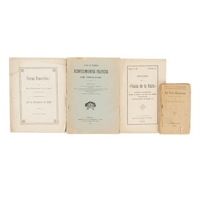 Subasta 1030, Lote # 96 Pineda, Manuel / Martínez Rojas, Jesús / Suárez Silva, Jaime / Autores Varios. Sistema Democrático / Los Últimos Acontecimientos Políticos de Chiapas / Por Tierra Chiapaneca / Memoria de la Fiesta de la Raza. a) Pineda, Manuel. Sistema Democrático. San Cristóbal de las Casas, Chiapas. San Cristóbal: Tipografía Flores, 1911. 8o. marquilla, 9 p. Subrayado; manchas de humedad. Pastas en rústica, cosido. b) Martínez Rojas, Jesús. Los Últimos Acontecimientos Políticos de Chiapas. México: Imprenta de A. Carranza e Hijos, 1912. 8o. marquilla, 127 p. Estudio del amparo contra actos de su legislatura que privó al Sr. Lic. D. José Antonio Rivera G. de la mayoría absoluta de votos que obtuvo en las elecciones populares para gobernador del estado, y colocó al derrotado en ellas en el gobierno. Portada anterior desprendida, sin lomo; faltante en margen. Encuadernado en rústica. c) Suárez Silva, Jaime. Por Tierra Chiapaneca (Crónicas de Viaje). Tuxtla Gutiérrez, Chiapas, 1915. 16o. marquilla, 1 - 64 + 73 - 152 p. Portada con rasgadura en la parte inferior, páginas 108, 116 recortadas en margen exterior. Cosido. d) Autores Varios. Memoria de la Fiesta de la Raza. Tuxtla Gutiérrez: Imprenta del Gobierno del Estado, 1917. 8o. marquilla, 63 p. Pasta posterior sin punta inferior. Encuadernado en rústica. Total de piezas: 4. Estimado $3,000-4,000