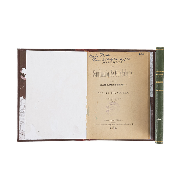 Subasta 1004, Lote # 174 Muro, Manuel / Montúfar, Alonso de. Historia del Santuario de Guadalupe de San Luis Potosí / Información que el Arzobispo de México D. Fray Alonso de Montúfar Mandó Practicar con Motivo de un Sermón que en la Fiesta de la Natividad de Nuestra Señora… a) Muro, Manuel. Historia del Santuario de Guadalupe de San Luis Potosí. San Luis Potosí: Tip. de Dávalos, 1894. 8o. marquilla, 59 p. Una lámina. Sellos y notas de antiguo propietario. Encuadernado en pasta dura, lomo en piel. b) Montúfar, Alonso de. Información que el Arzobispo de México D. Fray Alonso de Montúfar Mandó Practicar con Motivo de un Sermón que en la Fiesta de la Natividad de Nuestra Señora (8 de setiembre de 1556) Predicó en la Capilla de S. José de Naturales del Convento de S. Francisco de Mejico, el Provincial Fray Francisco de Bustamante acerca de la Devoción y Culto de Nuestra Señora de Guadalupe. México: Litografía y Encuadernación de Ireneo Paz, 1891. 8o. marquilla, XIII + 188 + III p. Una tabla plegada. Conserva pasta anterior original en rústica. Sellos de antigua biblioteca. Encuadernado en pasta dura. Total de piezas: 2. Estimado $7,000-9,000