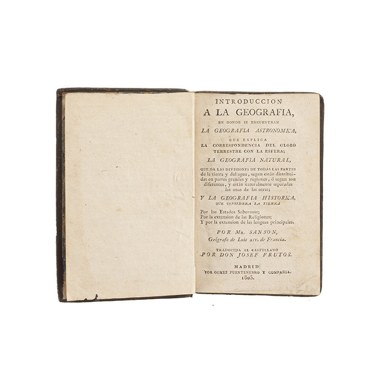 Subasta 1004, Lote # 183 Mr. Sanson (Hijo, Guillaume o Adrien). Introducción a la Geografía en Donde se Encuentran la Geografía Astronómica, que Explica la Correspondencia del Globo Terrestre con la Esfera; la Geografía Natural y la Geografía Histórica que Considera la Tierra. Madrid: Por Gómez Fuentenebro y Compañía, 1805. 16o. marquilla, XVI + 275 p. Sin cofia. Encuadernado en pasta dura, en piel. "La Geografía era antiguamente una de las ciencias conocidas por muy pocos. Las Buenas Letras, las Guerras, el Comercio y los freqüentes Viages la han hecho considerar tan necesaria en estos últimos siglos, que el presente es de todos los conocimientos aquel cuya ignorancia es la menos permitida... Esta ciencia tan útil al Público ha estado como enterrada hasta el fin del siglo pasado de 1600, no habiendo sido tratada hasta entonces sino muy confusamente... Y que Nicolás Sanson, mi padre, fue el primero que la puso en orden, y la hizo fácil y comprehensible...". Véase en: Prólogo, página V. Estimado $6,000-8,000