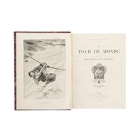 Subasta 1004, Lote # 194 Charton, Édouard. Le Tour du Monde. Journal des Voyages et des Voyageurs / À travers le Monde. Paris: Librairie Hachette, 1897. 4o. marquilla, 2 + 636 + 421 p. Profusamente ilustrado. Lomo con títulos en dorado. Encuadernado en pasta dura, lomo en piel. Recopilación de artículos sobre exploraciones y viajes alrededor del mundo, escritas por algunos de los más importantes exploradores de la época, cada viaje ilustrado con fotograbados, dibujos, planos y mapas. Incluye, entre otros: 'En Californie, quelques Courses en Sierra Nevada' por M. F. de Longe, 'Au Pays des Bouriates' por M. Chimkievitch, "À travers l'Afrique. De l'Est à l'Ouest' por M. Le Comte de Goetzen, etc. Estimado $6,000-8,000