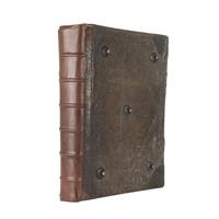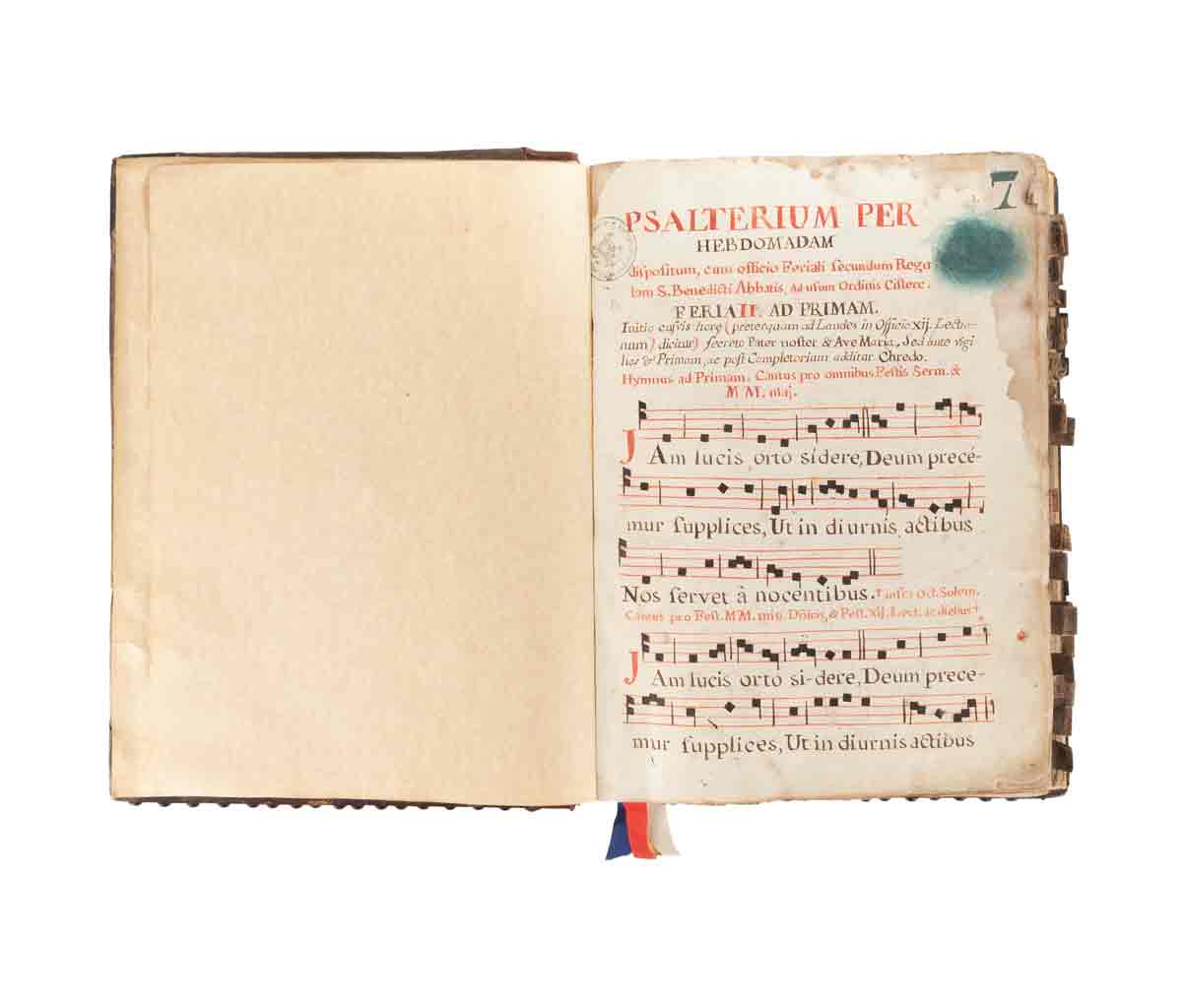 Subasta 1012, Lote # 251 Psalterium per Hebdomadam Dispositum, cum Officio Feriali Secundum Regulam S. Benedicti Abbatis, ad Usum Ordinis Cisterc. fo. marquilla, 478 + XXXIX p. (Officium B. M. V. in Sabbato). Libro de Salmos, manuscrito. Portada con dos sellos, uno ilegible y otro cubierto con tinta. Mancha de humedad en punta superior en páginas 1 - 50. Páginas: 38, 39, 63, 64, 333 - 336, 367 restauradas tercio inferior; 152 sin punta inferior; 202, 248, 254 con faltante en margen inferior. No hay página 91 y la 290 se repite, sin afectar continuidad del texto. Pastas de madera, forro en piel labrada, claveteadas con 5 tachones cada una y puntas de bronce; cantos inferiores protegidos con remaches. Cuatro separadores de listón de seda y pestañas de pergamino en media caña. Lomo y guardas nuevos. Encuadernado en pasta dura. Estimado $30,000-40,000
